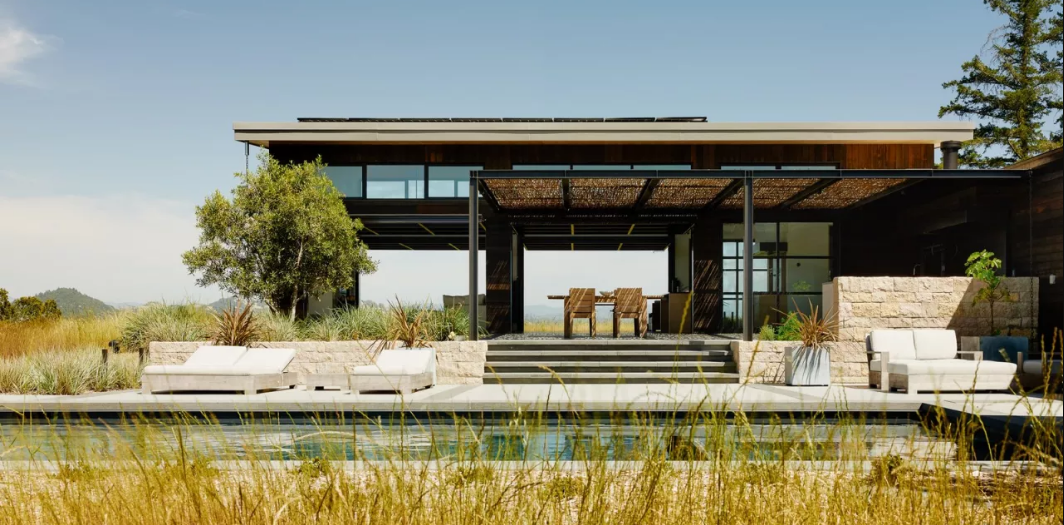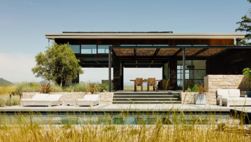 Dit strakke buitenhuis staat boven op een heuvel in Californië en kijkt uit op het dorp Healdsburg. Het huis oogt strak en is perfect om je terug te kunnen trekken. Met de grote glazen wanden kan je optimaal genieten van al het pracht en praal van de natuur.