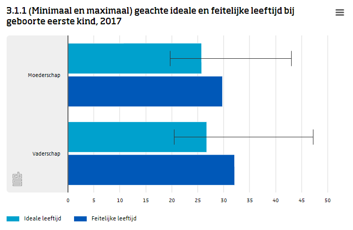 Wat betreft de maximale leeftijd vinden mensen van 45 jaar en ouder dat vrouwen vanaf ongeveer 42 jaar te oud zijn om moeder te worden. Bij jongeren tussen de 18 en 25 jaar ligt deze grens hoger, namelijk op 44,4 jaar. Leeftijdsgroepen lijken niet van mening te verschillen over de maximale leeftijd voor het vaderschap. Het is natuurlijk ook zo dat de oudere generaties hun kinderen al op jongere leeftijd kregen dan de huidige generaties (Te Riele en Loozen, 2017). Dit zal ongetwijfeld invloed hebben op de meningen. Daarnaast speelt het opleidingsniveau en mate van religie ook een rol bij het vormen van deze meningen.