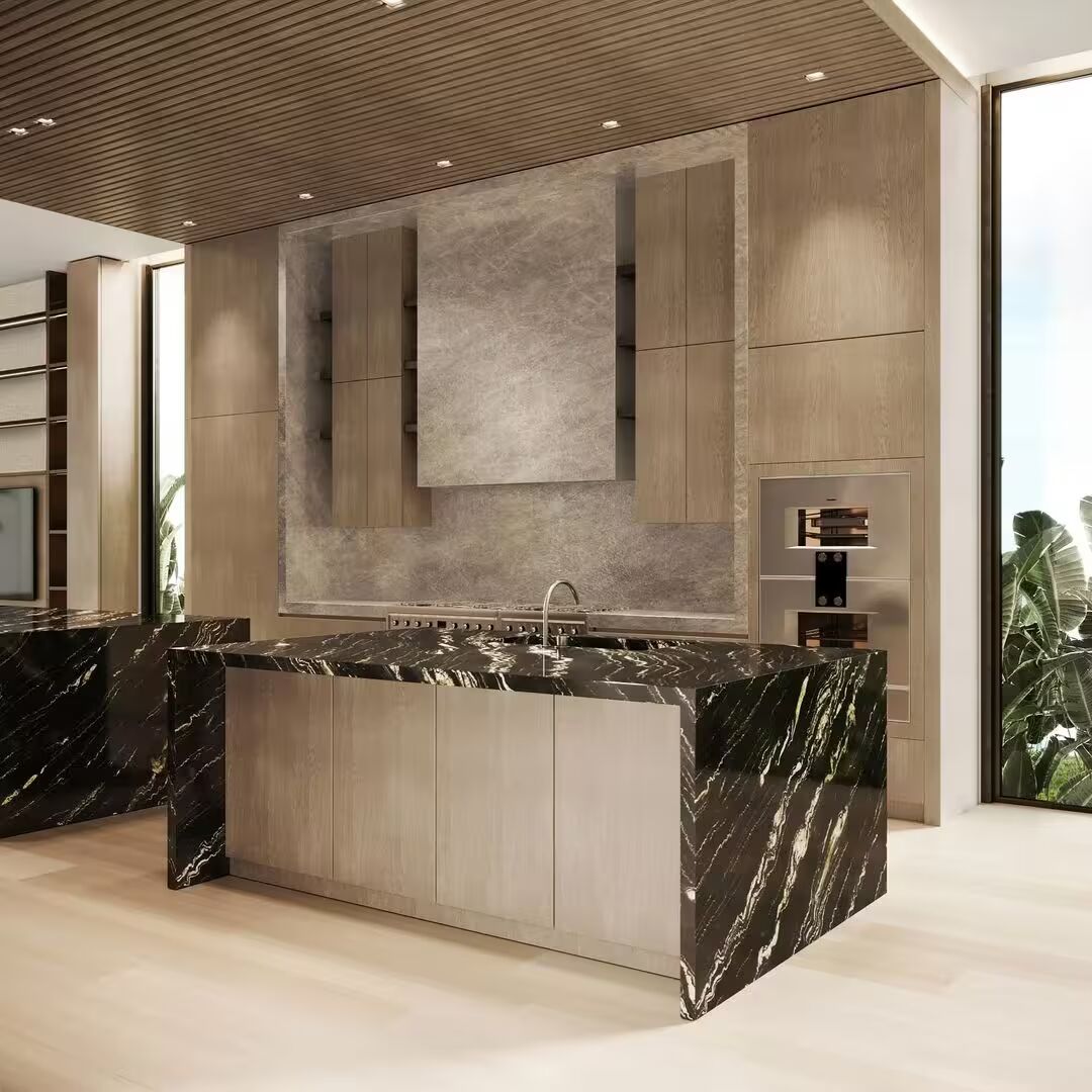Aan de binnenzijde maakt het herenhuis al je verwachtingen waar, wat begint bij een zeer imponerende woonkeuken. In dit vertrek is veelvuldig gebruik gemaakt van zwart marmer, dat absolute luxe ademt. Er is rekening gehouden met grote kookeilanden, hoge ramen en alle denkbare inbouwapparatuur. Deze ruimte mondt uit in de spectaculaire living, waar David goed tot rust zal komen. Door middel van de ramen kijkt hij uit over de achtertuin en het water, terwijl hij heerlijk zal zitten in één van de comfortabele zitgelegenheden in deze woonkamer. Grote schuifdeuren maken het overigens mogelijk om vanuit de living naar het buitenterras te lopen. Hier zijn tal van royale zonnestoelen neergezet en mag ook het buitenzwembad uiteraard niet ontbreken.