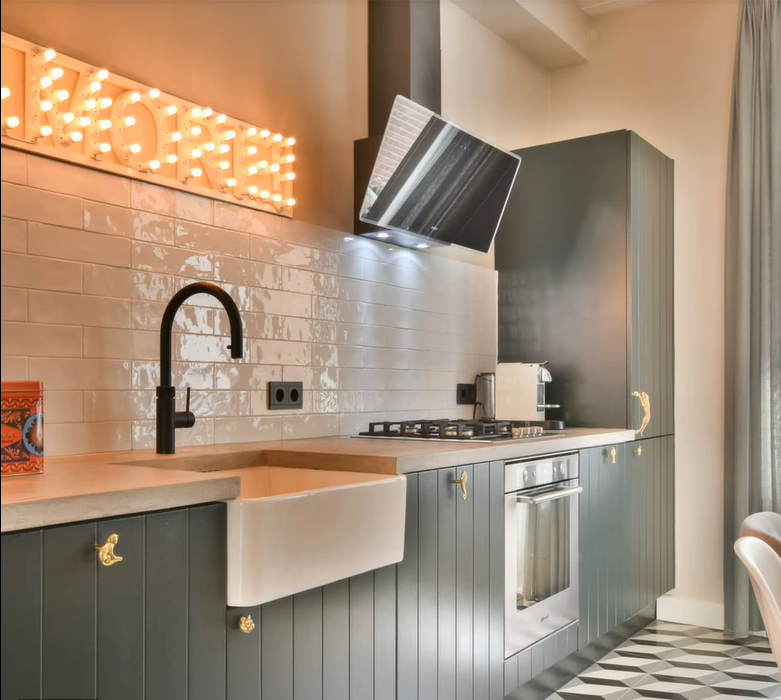 De zwarte keuken heeft een speelse vloer en is voorzien van diverse inbouwapparatuur. Via de openslaande deuren in de keuken kom je bij het zonnige balkon van ca. 11m2.