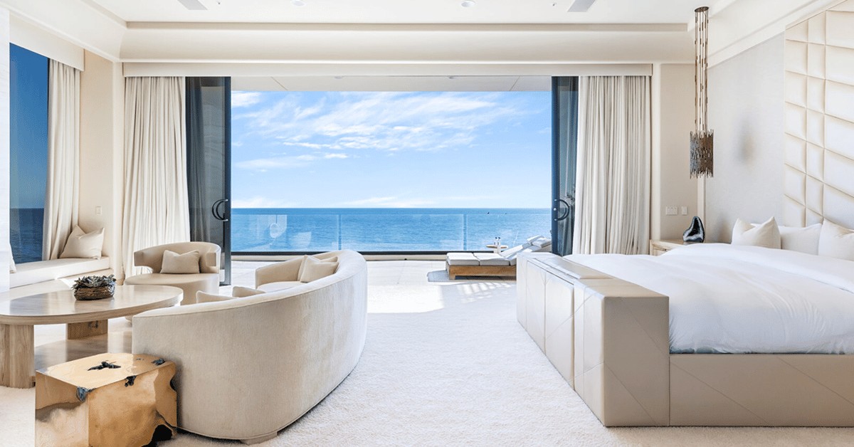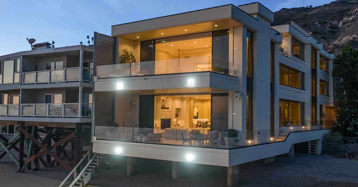 Het herenhuis met drie verdiepingen is gebouwd in het begin van de jaren negentig en bevindt zich op een perceel van 650 vierkante meter aan Malibu’s Billionaires Beach, de bijnaam van Carbon Beach. Het moderne huis heeft een woonoppervlak van ongeveer 836 vierkante meter en heeft hoge glazen wanden om te genieten van het adembenemende uitzicht.