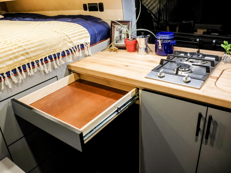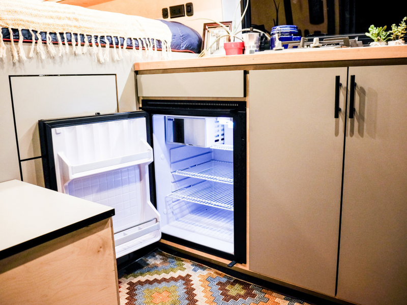 Binnenin zit ook een compacte kitchenette (een keuken bedoeld voor kleine maaltijden) met een dubbel gasfornuis en minikoelkast. Ook zit in de kitchenette een roestvrijstalen gootsteen met een afneembare deksel die tegelijkertijd als snijplank kan fungeren. De minikeuken heeft een uitzetraam voor frisse lucht en zodat het niet te warm wordt in de bus tijdens het koken. De waterleiding en afvoer werken via een pomp en een filtersysteem, waardoor het water opnieuw kan worden gebruikt.