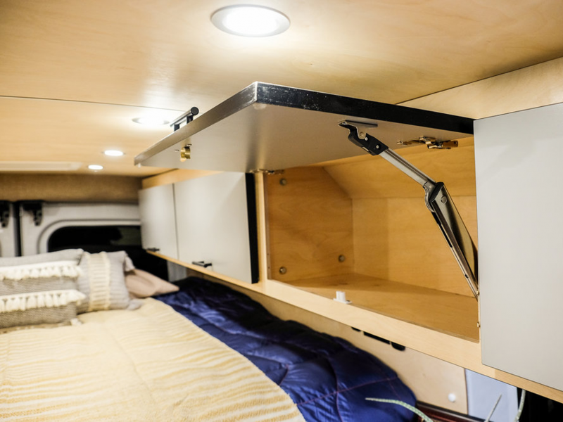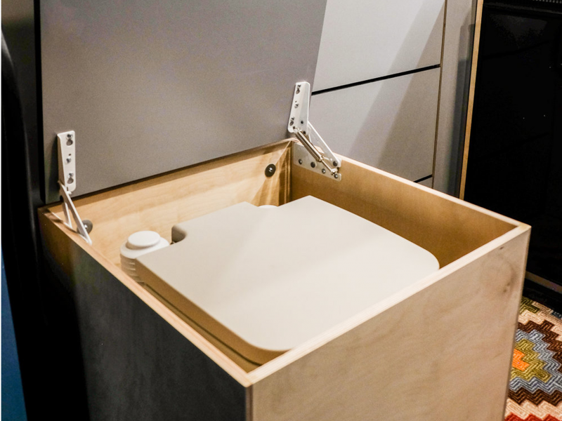 Er is een stoel met opbergruimte, waar het toilet in zit. Doordat deze verborgen zit, kun je ook comfortabel op de opbergplek zitten. Alle laden in de bus zijn voorzien van een push-to-open-systeem. Dit zorgt ervoor dat de laden dicht blijven, ook tijdens een hobbelige rit.