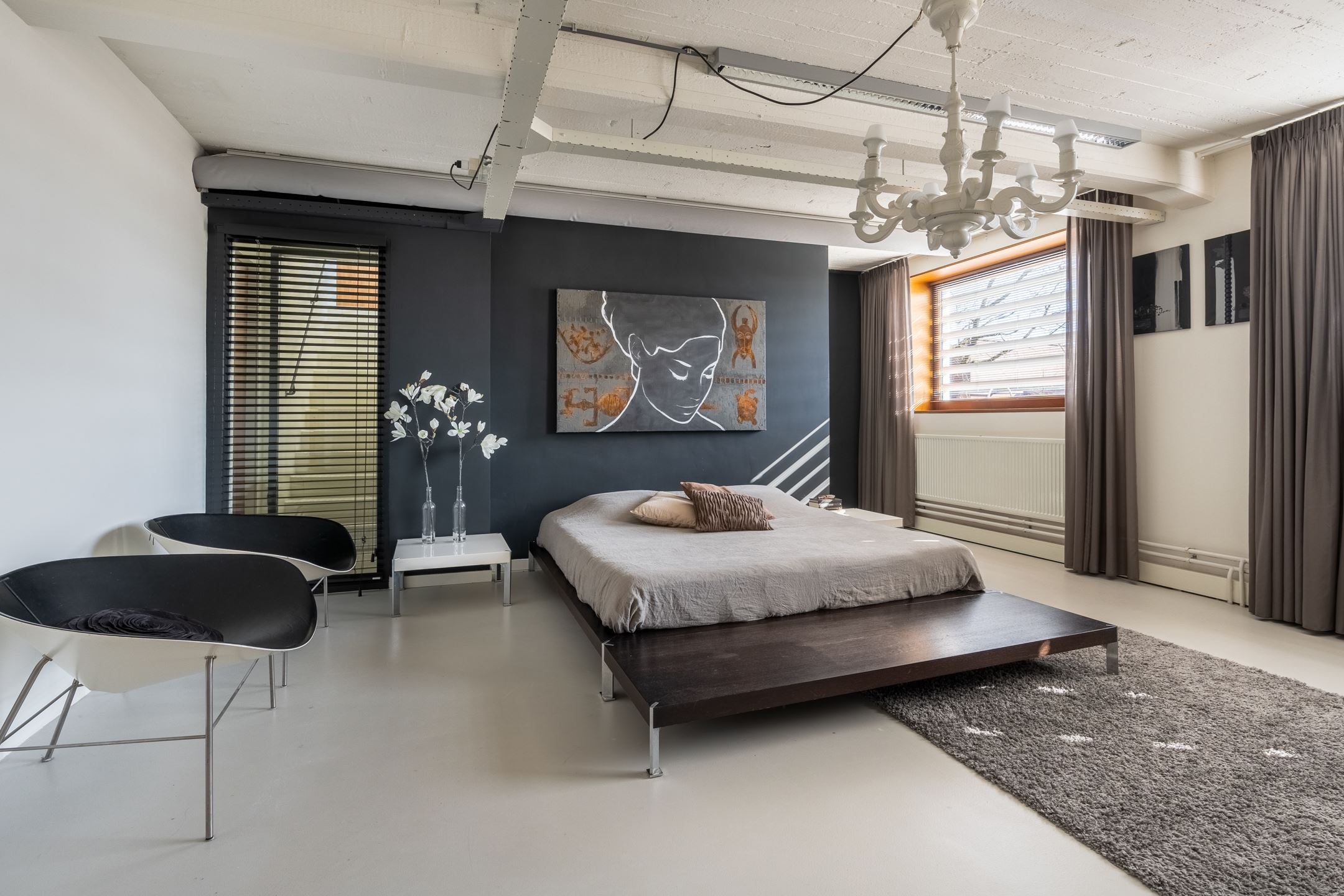 De begane grond bestaat uit een ontvangsthal, tussenhal, woonkamer, woonkeuken, muziekkamer, badkamer en twee slaapkamers. Wanneer je naar binnen kijkt, zie je dat elke kamer modern is ingericht met een kleurthema van wit, grijs en zwart. Een droomwoning voor iedereen die van een moderne inrichting en ruimte houdt.