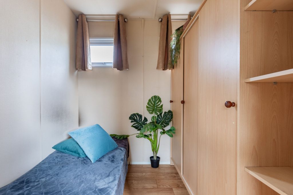 Bij binnenkomst, zie je in een oogopslag het hele stulpje. Die bevindt zich direct aan je linkerzijde. En aan je rechterzijde vind je de badkamer met de douchecabine, toilet en wastafel. Het chalet beschikt over twee slaapkamers. De grootste slaapkamer, voorzien van een tweepersoonsbed, vind je aan de achterzijde van de caravan. Naast deze kamer is de andere kamer gevestigd die is voorzien van een eenpersoonsbed en een kledingkast. De woonkamer kijkt uit op het weiland met koeien en biedt alle ruimte voor een eet- en zitgedeelte. Mocht je op een heerlijke zomerdag nog even willen genieten, kan je via de openslaande deuren van de woonkamer zo het terras op.