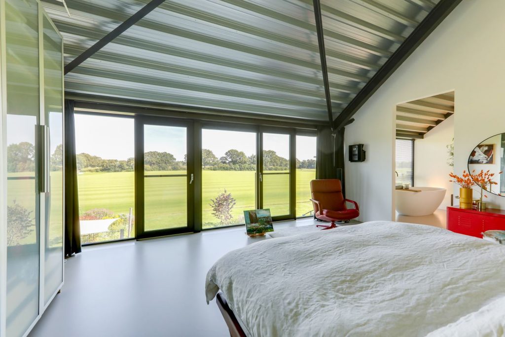 In de ontvangsthal vinden we de trap naar de bovenliggende verdieping, waar een doolhof van gangen en deuren ons bij de masterbedroom brengt. Dit vertrek is minstens net zo groot opgezet als de aangrenzende silo en beschikt net als de living over een fenomenaal uitzicht. Wat er in de slaapkamer van een miljoenenwoning uiteraard niet kan ontbreken is de en suite badkamer. De toekomstige eigenaar van deze voormalige graanmaalderij wordt hier verwend met een luxe ligbad en ruime inloopdouche. Deze douche is, wegens het veelvuldig gebruik van marmer, werkelijk hotelwaardig te noemen.
