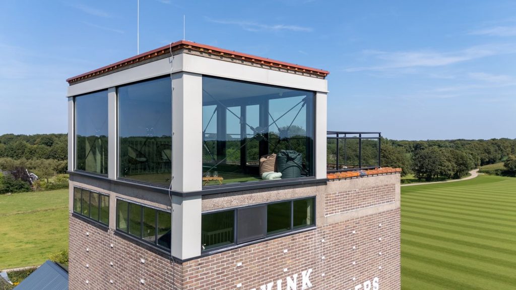 Als we weer terugkomen op de begane grond mag het beklimmen van de aangebouwde silotoren beginnen. De nostalgische trappartijen brengen ons naar de top van het gebouw, die zich maar liefst 18 meter boven de grond bevindt. Aan de toren is veel bewaard gebleven, waardoor je nog veel van z’n oorspronkelijk staat terugziet. Halverwege de klim naar de top vinden we overigens een comfortabele badkamer aan, waar het zweet even van het voorhoofd kan worden gewassen. Eenmaal bovenin kan er worden genoten van een royale ruimte van 36 vierkante meter met een panoramisch uitzicht over het landschap van Zelhem. Op dit grote dakterras ervaar je volgens de makelaar het gevoel van absolute vrijheid.