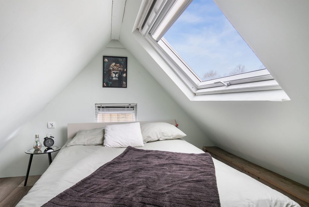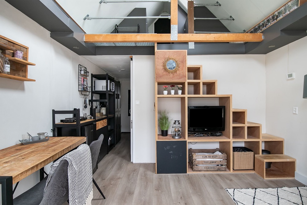 Het tweede huis aan de tuinkant is uiteraard een stuk minder ruim. Toch biedt het huisje prima woongelegenheid voor twee mensen. Er is sprake van één slaapkamer die zich helemaal in de nok van het huis bevindt. De trap die toegang tot deze kamer mogelijk maakt heeft een dubbele functie. Zo is het naast een trap ook een kast. Handig en efficiënt!