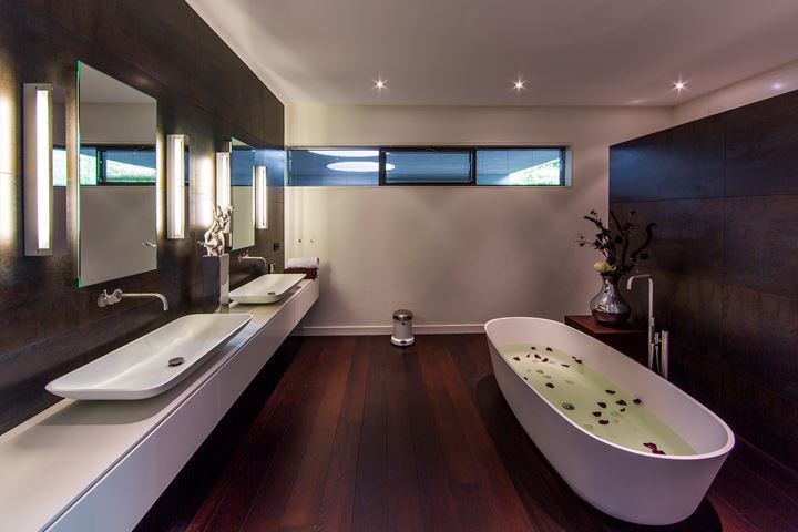 Buiten begint de entree van het huis al in de binnentuin met vijver. Deze loopt over in de royale hal met vide, doorkijk op tuin en natuurvijver. Vervolgens kom je binnen in de prachtige woonkamer die beschikt over alle luxe die je maar kan wensen. Met een open haard die grenst aan de loungeruimte net als de tv-kamer, eetkamer en een keuken met klasse. Met de aangrenzende schuifpuien kom je bij het overdekt terras. Met als laatst nog een doorloop naar ruime bijkeuken en dubbele garage. Op de begane grond bevindt zich nog de masterbedroom met een walk-in closet en zeer luxe badkamer. Deze badkamer beschikt over een ligbad, dubbele vaste wastafel, douche en een wc.