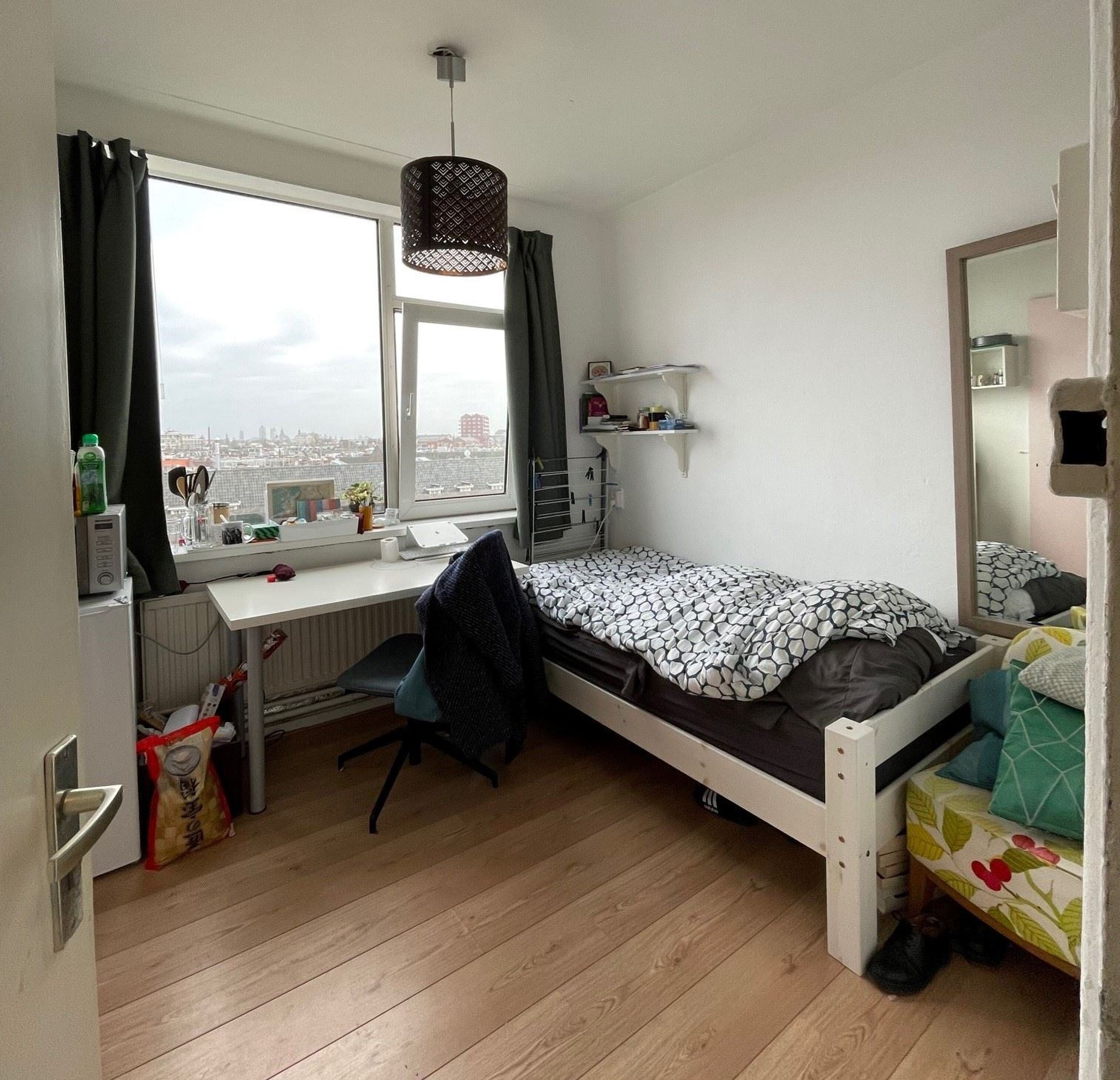 Een praktische kamer in Amsterdam, zo wordt het omschreven in de Funda-advertentie. De mini-kamer is voor een bedrag van maar liefst 100.000 euro te koop. Wat je voor het geld krijgt, is het volgende: de kamer is 11 vierkante meter en heeft een handige inbouwkast, een wastafel met spiegel en planchet. Er is voldoende ruimte om een bed en bureau of kast in kwijt te kunnen. Veel bewoners hebben ook een koelkastje in de kamer geplaatst. De kozijnen in de kamer zijn uitgevoerd met dubbel glas, een kantelraam en ventilatie, een radiator, een modern intercom systeem waarmee je via een app (met beeld) de bezoeker toegang kunt geven tot het gebouw. De kamer heeft een nette laminaatvloer welke nog prima dienst kan doen.