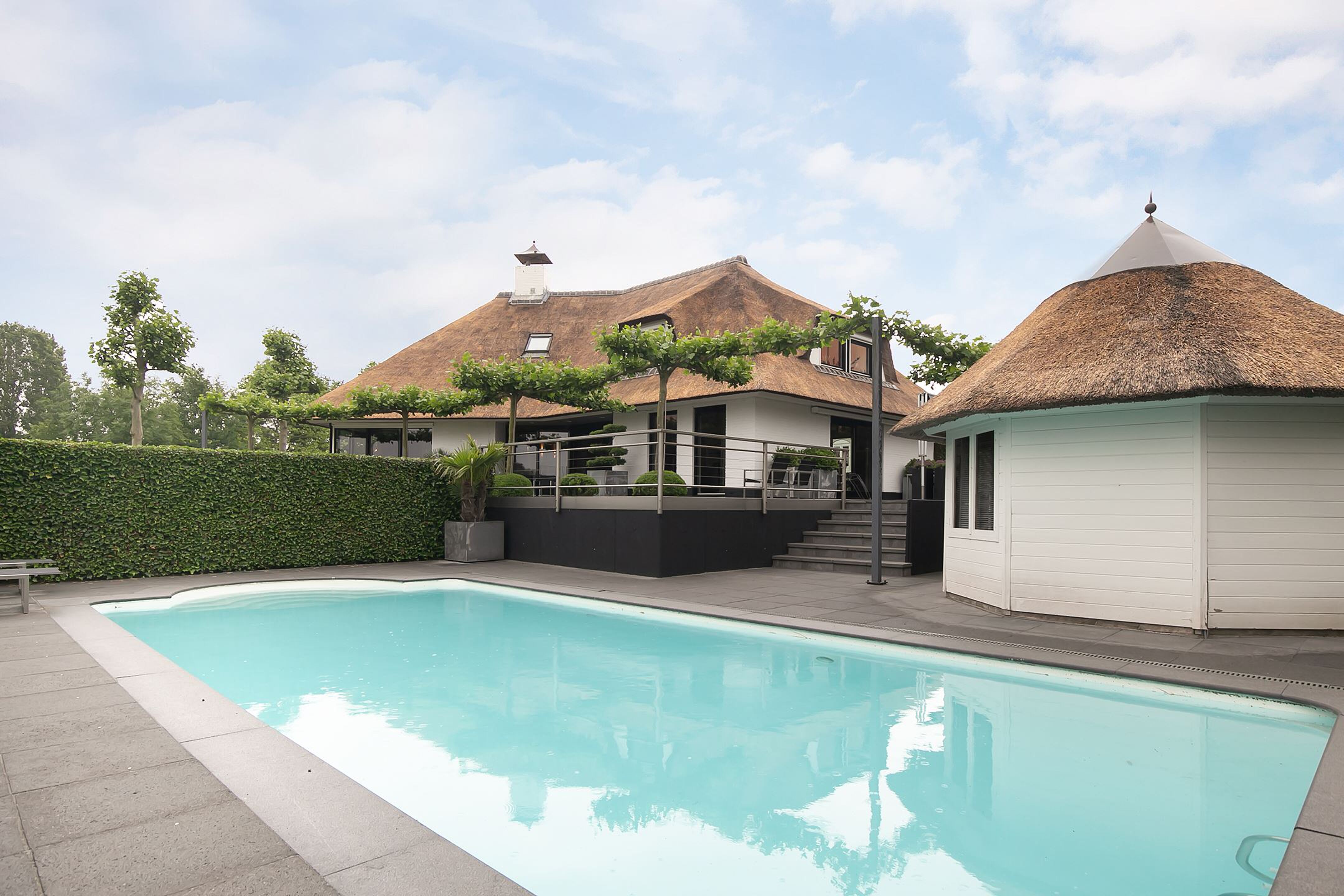 Je komt het niet vaak tegen dat je alleen al bij het zien van de foto’s op slag verliefd wordt. Bij dit schitterend gelegen en goed onderhouden landhuis in Zeeland is dat waarschijnlijk wel het geval. Je kan namelijk op een lap grond van 177 vierkante meter wonen in een landhuis met een rieten dak. In totaal heb je dan de beschikking over een woonoppervlak van 374 vierkante meter. Lekker ruim dus, maar je hoeft niet binnen te blijven. In de tuin bevindt zich namelijk een prima verwarmd zwembad zodat je na een tuinfeest nog even lekker kan zwemmen. Desnoods geheel skinny dippend. De hoge heg zorgt namelijk voor voldoende privacy zodat je ongestoord je gang kan gaan.