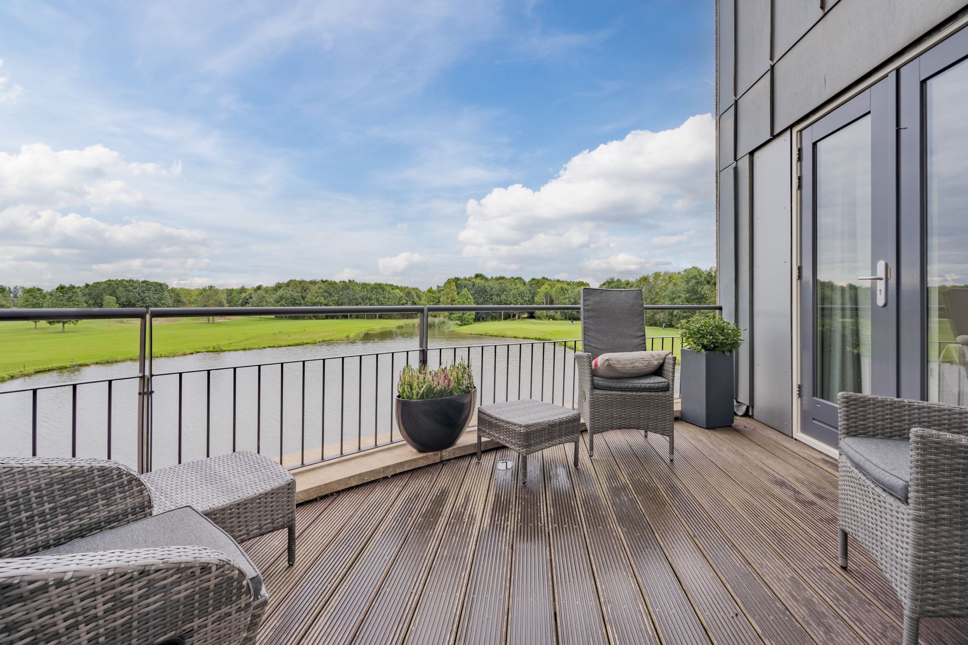 De entree/hal biedt toegang tot de fijne werkkamer. Op de begane grond bevindt zich ook het gastentoilet, garage en de meterkast. Door de hoeveelheid aan glaspartijen heeft de woning een ruimtelijk gevoel en heb je tegelijkertijd ook nog eens een schitterend uitzicht op de golfbaan. Buiten bevindt zich de berging, waar je bijvoorbeeld fietsen kunt opbergen. In de berging tref je de ontkalkingsinstallatie aan, die de waterhardheid voor de hele woning reguleert.