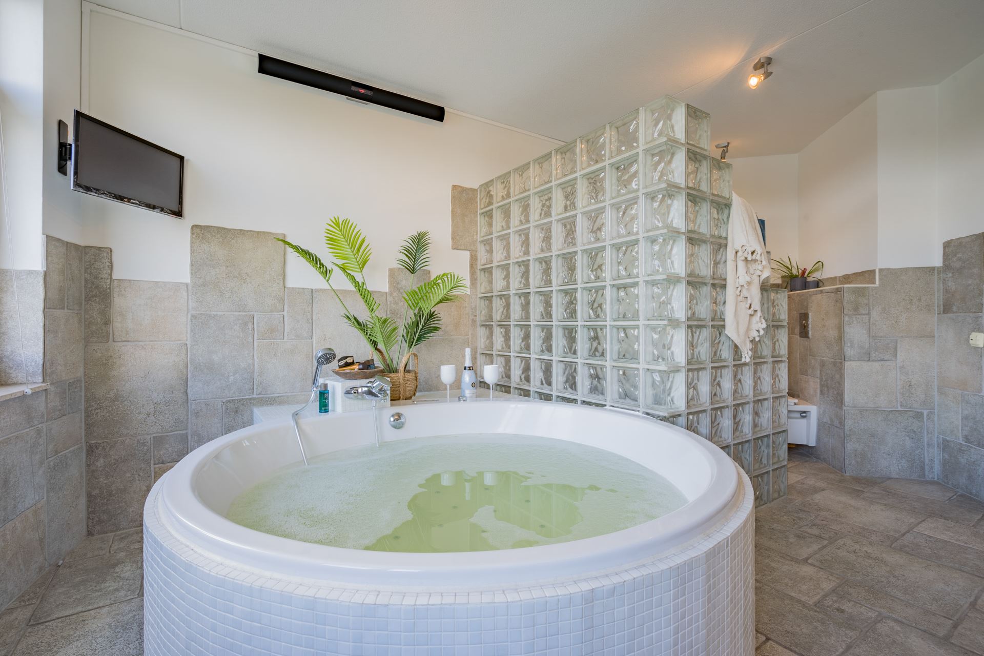 Op de eerste verdieping bevindt zich de halfronde woonkamer van maar liefst 55 vierkante meter met negen raampartijen. De woonkamer heeft een luxe uitstraling door de lichte natuurstenen vloer, ledwandverlichting, de video-intercominstallatie en de halogeen spots op het plafond.