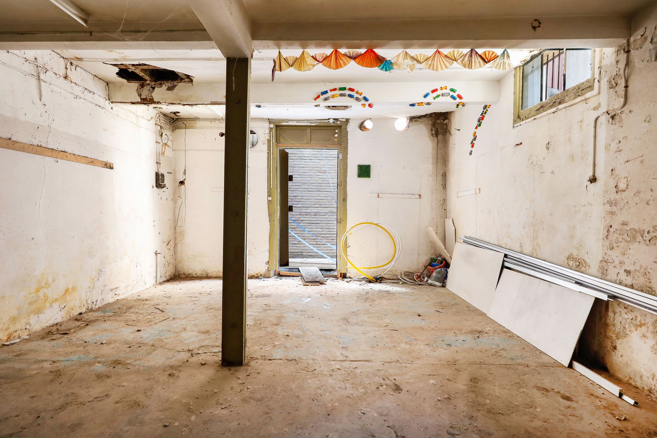 We gaan naar de woning. Of ja, naar de plek die een woning kan worden. Aan de linkerzijde is een deur te vinden Dit is de toegang tot een hal en trap. In het pand zitten namelijk twee appartementen, waarmee je enkel de entree deelt. Zelf loop je op de eerste verdieping door naar achter om in een grote ruimte met groot raam te komen. Een ideale plek voor iemand met een kantoor of praktijk aan huis! De begane grond is een grote ruimte met stalen pilaren. Er is een tuintje bij de entree en een tuintje aan de achterzijde. Je komt de woning echter binnen op de 1e verdieping met een bruggetje, met ruimte voor een eventueel balkon.