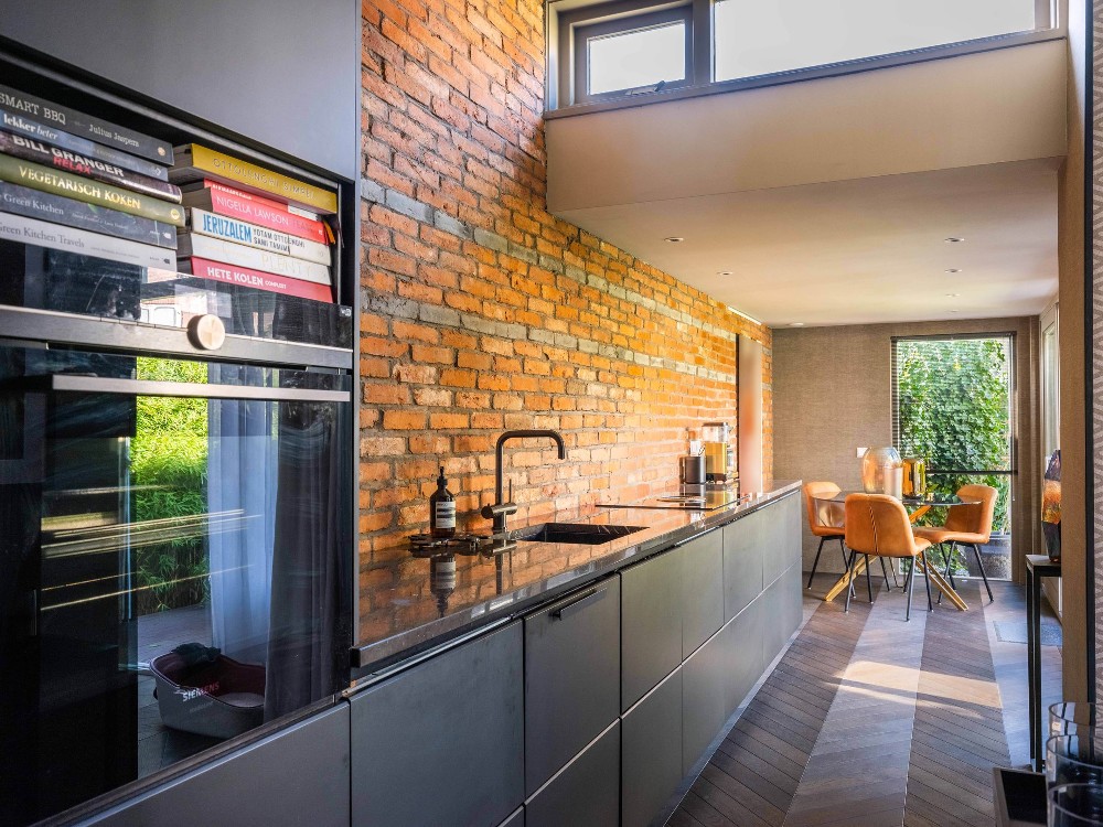 In de woning in Alkmaar kom je binnen in de hal met een gedeeltelijk glazen vloer, wat ons een doorkijkje geeft naar de opvallende wijnkelder. Verder is er een aparte toilet in de gang die is bekleed met zwart marmer. Ook de moderne keuken is zwart, met een stijlvol marmeren blad. Daarnaast heeft het en prachtige Brickstone muur waardoor je echt dat luxe gevoel krijgt. In de keuken is er ook een eethoek en een schuifpui naar de achtertuin.
