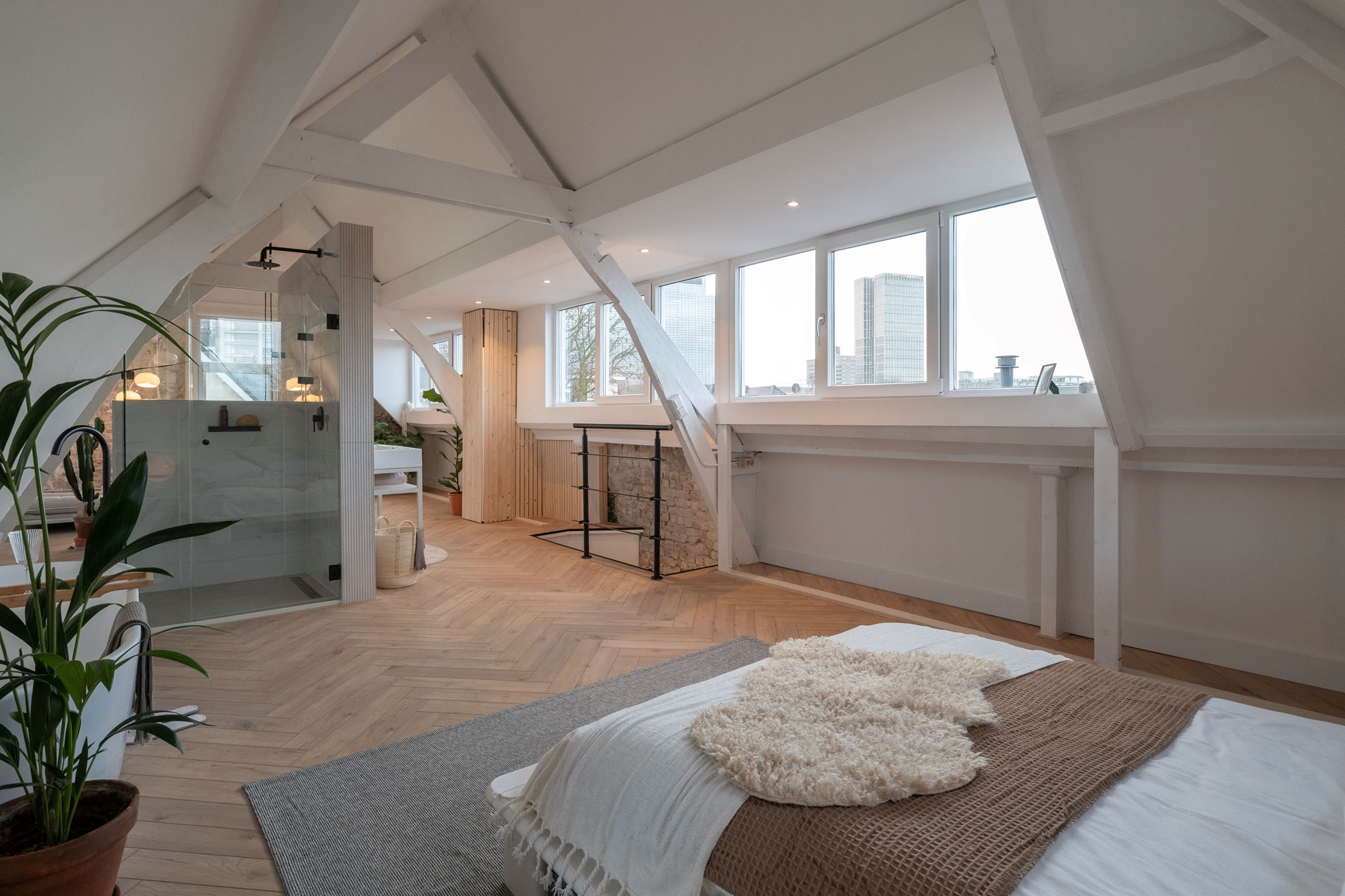 Het appartement bestaat uit drie etages, waarbij de eerste etage slechts een trappenhuis naar de tweede etage is. Op de tweede etage vind je een grote doorzonwoonkamer inclusief open keuken. Deze moderne keuken bestaat uit een kookeiland en inbouwapparatuur zoals een oven en vaatwasser. Verder is er nog een toilet te vinden op deze etage. Op de derde etage is de slaapkamer te vinden, daarnaast is er een badkamer die perfect bij de rest van de woning past, met een bad en inloopdouche.