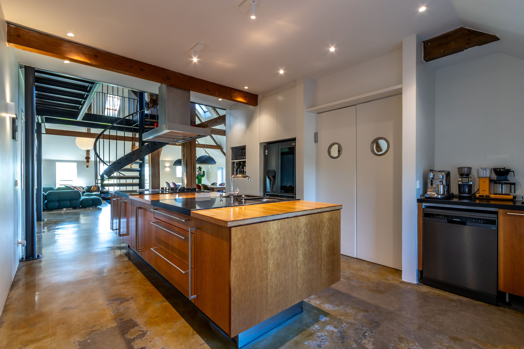 Aansluitend aan de woonkamer zit een heerlijk keukeneiland, met een absolute retro-uitstraling. De klapdeuren met rond glas geven je absoluut het gevoel dat je in de keuken staat.