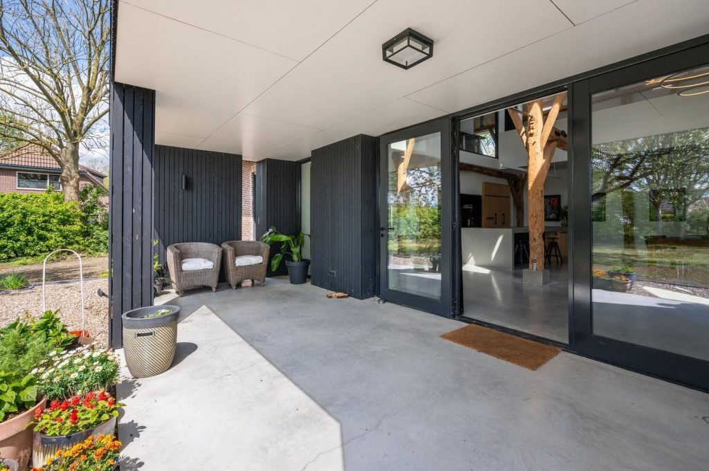 Bij deze prachtige omgeving past enkel een woning zoals deze. De foto’s zijn te vergelijken met een oud-Hollands schilderij, schitterend! Bij het betreden van de oprijlaan springt allereerst de schoonheid van de oude woonboerderij in het oog. De voorzijde van het huis is enorm en overweldigend. Ook valt de voordeur erg op. Hier zijn namelijk de oude staldeuren van weleer nog te zien. Deze deuren staan geopend waarachter zich de daadwerkelijke voordeur bevindt. De architect door wie het huis in 2021 volledig werd gerenoveerd, heeft er dus aan gedacht om de antieke charme van de boerderij terug te laten zien. Bij binnenkomst zien we deze details ook veelvuldig terug. De enorme houten balken verraadden dat de woning van origine een boerderij is. Het maakt de woning wel heel ruimtelijk en het plafond is geplaatst op maar liefst elf meter hoogte. Om deze ruimte optimaal te benutten is er niet gekozen voor een normale trap naar de bovenliggende kamers. De architect heeft gekozen voor een zogeheten ‘loopbrug’ die het voorhuis met de slaapkamers in verbinding brengt. Wanneer je naar beneden kijkt, is de betonnen vloer te zien die voorheen ook daadwerkelijk in de stal heeft gelegen.
