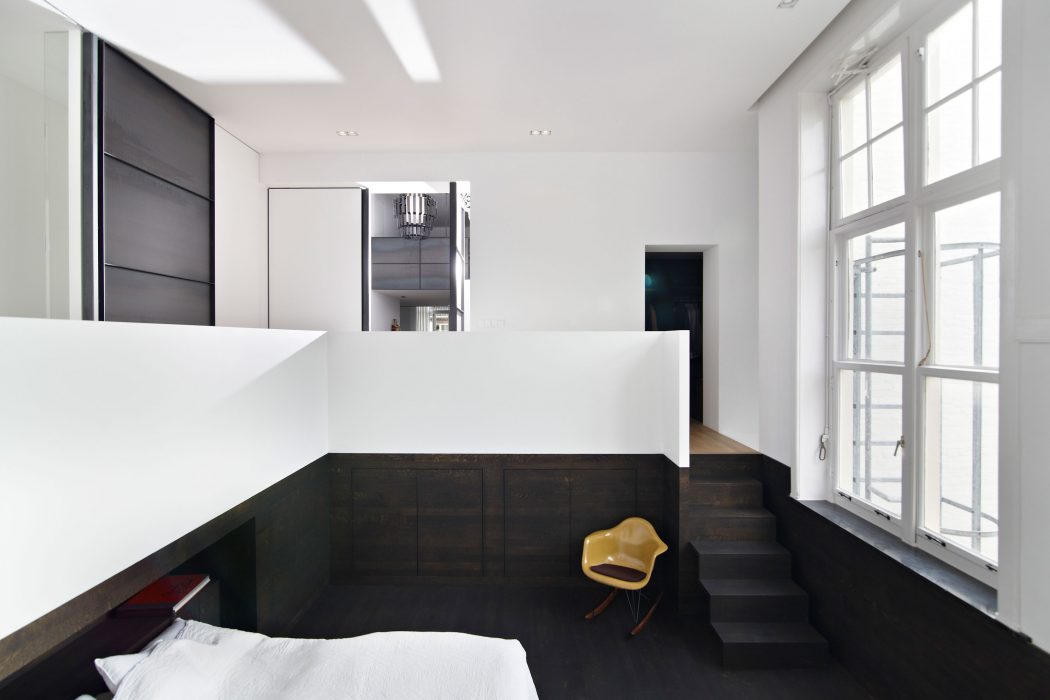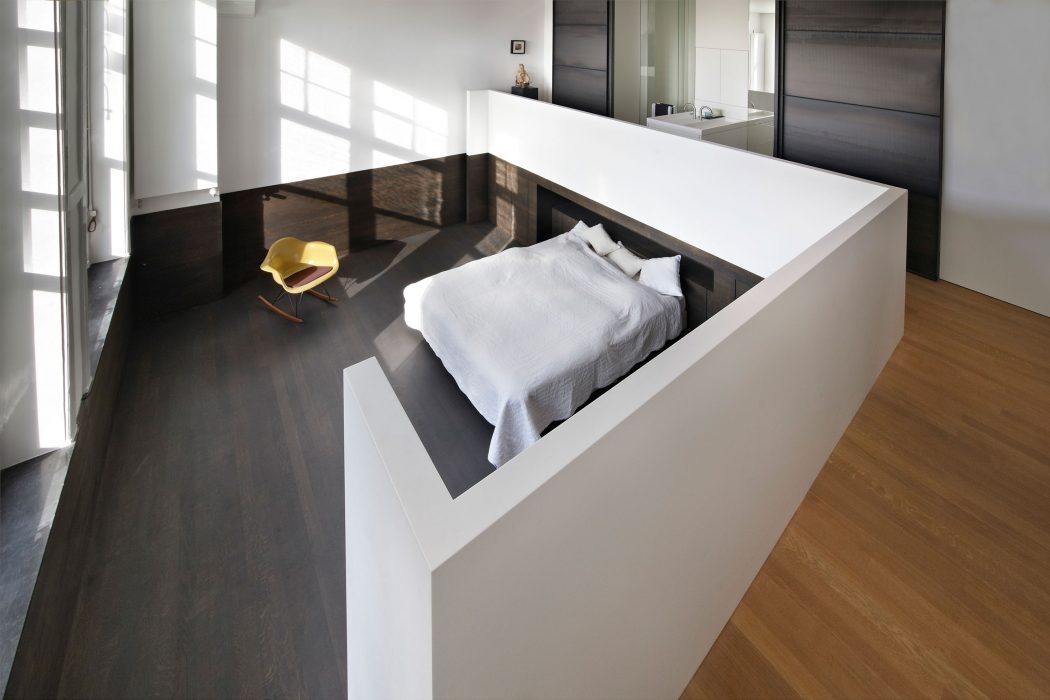 De uitbreiding heeft de master bedroom gerealiseerd. De karakteristieke elementen maken plaats voor de strakke lijnen. Het materiaalgebruik staat in regelrecht contrast met elkaar, maar vloeien perfect in elkaar over. In het gehele loft zien we minimalistische lijnen en een natuurlijk contrast tussen, industriële en authentieke elementen.