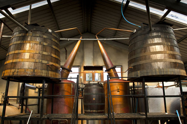 Distillatie: Tijdens de distillatie worden alle ongewenste stoffen verwijderd en de damp met een hoger alcoholpercentage wordt opgevangen en gecondenseerd. Deze wordt vervolgens verdund tot een alcoholpercentage van 65% en opgeslagen in eikenhouten vaten.