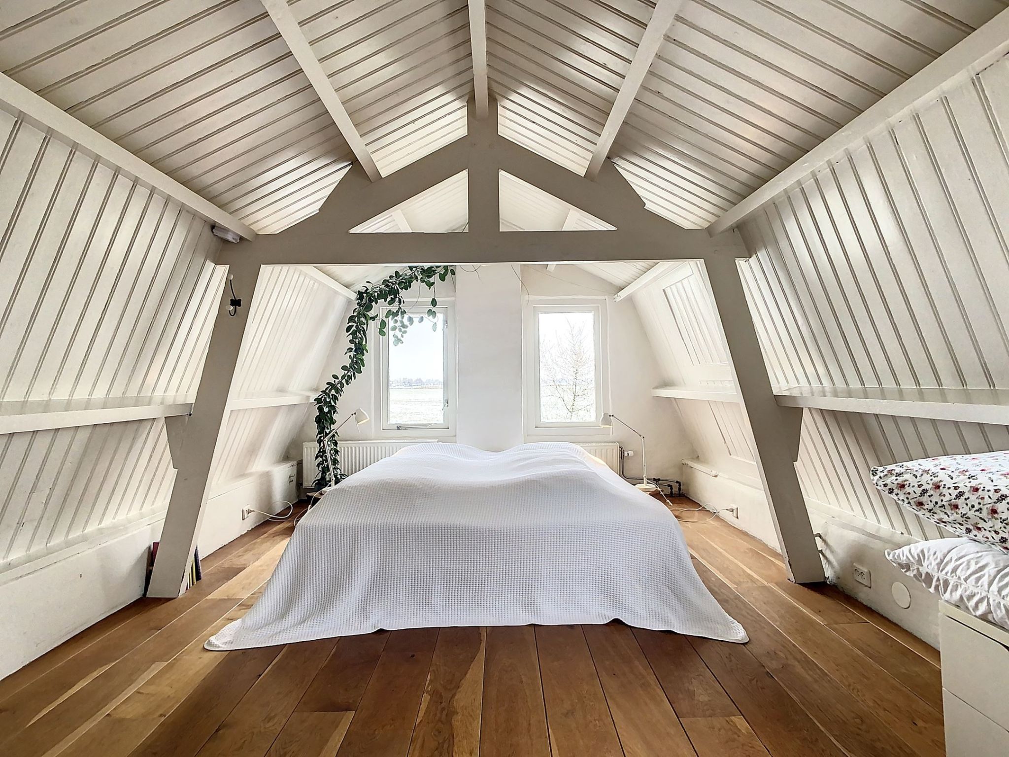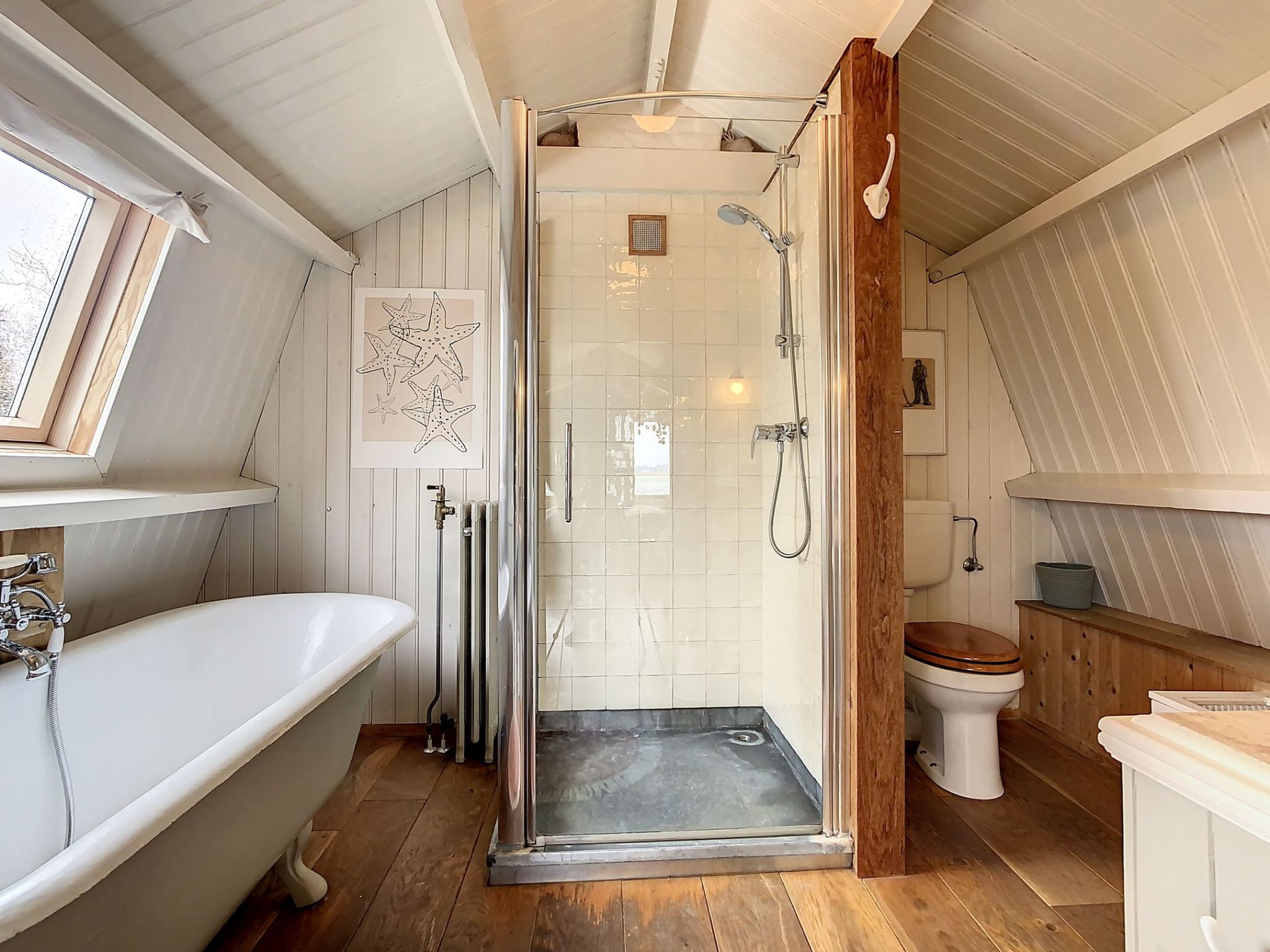 Nadat je de trap bent opgelopen, bevind je je meteen in de slaapkamer op de eerste verdieping. Je hebt daar alle ruimte voor een groot tweepersoonsbed en ook genoeg ruimte voor een bureau om op te werken. Ook bevindt zich op deze verdieping een echte vintage badkamer met alles erop en eraan zoals een fraaie douche met handgemaakte zinken bak, een heerlijk ligbad op pootjes, een uiterst bijzondere wastafel en een toilet.