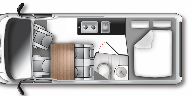 In de slaapkamer staat een ingebouwd tweepersoonsbed van ongeveer twee meter lang. Je kunt ook de helft van het bed nog inklappen zodat je meer opslagruimte hebt. In de keuken kunnen de stoelen van de chauffeur en bijrijder 180 graden gedraaid worden, zodat deze precies aan de eettafel passen. In het keukentje vind je ook een gasfornuis met twee pitjes, een gootsteen, voldoende opslagruimte en een koelkast met een inhoud van 70 liter. De camper heeft zelfs een boiler, zodat je warm water kunt gebruiken.
