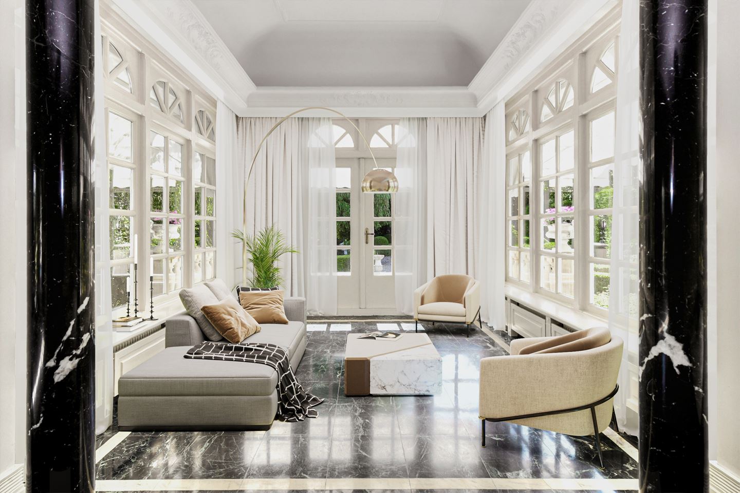 De entree van de woning is minstens net zo immens als de vraagprijs van de villa. Bij het binnengaan van de woning word je begroet door hoge marmeren pilaren die ondersteuning bieden voor het bovenliggende balkon. De stijl van het huis wordt door de makelaar omschreven als 19e-eeuws classicisme. Ook zouden we elementen uit het Duitse Thüringen terug moeten zien. Dat vertaalt zich in het gebruik van zandsteen, een diagonaal gedekte leiendak en klassieke dakkapellen.