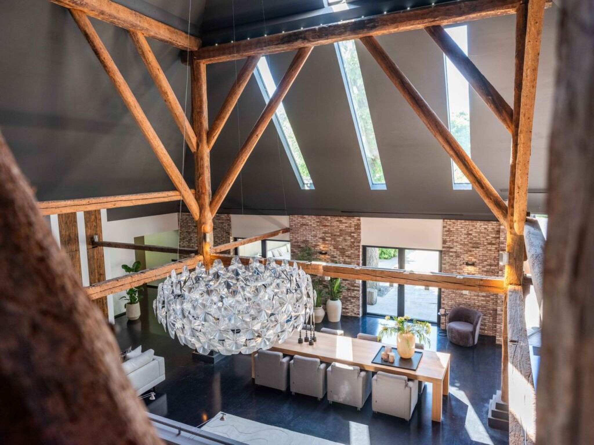 Ook het interieur van deze luxe woonboerderij in Bergen lijkt rechtstreeks uit een woonmagazine te komen. Binnen begint de rondleiding in een lichte hal, waar meteen de hoge plafonds en het gebruik van natuurlijke materialen opvallen. De woonkamer is een royale ruimte waarin de traditionele stijl van een boerderij samenkomt met eigentijdse luxe. Grote ramen laten het daglicht overvloedig binnenvallen en geven uitzicht op de tuin en het zwembad. De houten balken in het plafond zorgen voor warmte en karakter, terwijl de open haard een knusse sfeer toevoegt, vooral op winteravonden. De indeling is over het algemeen bijzonder ruim, zodat er genoeg plaats is voor een comfortabele zithoek en een aparte eethoek.