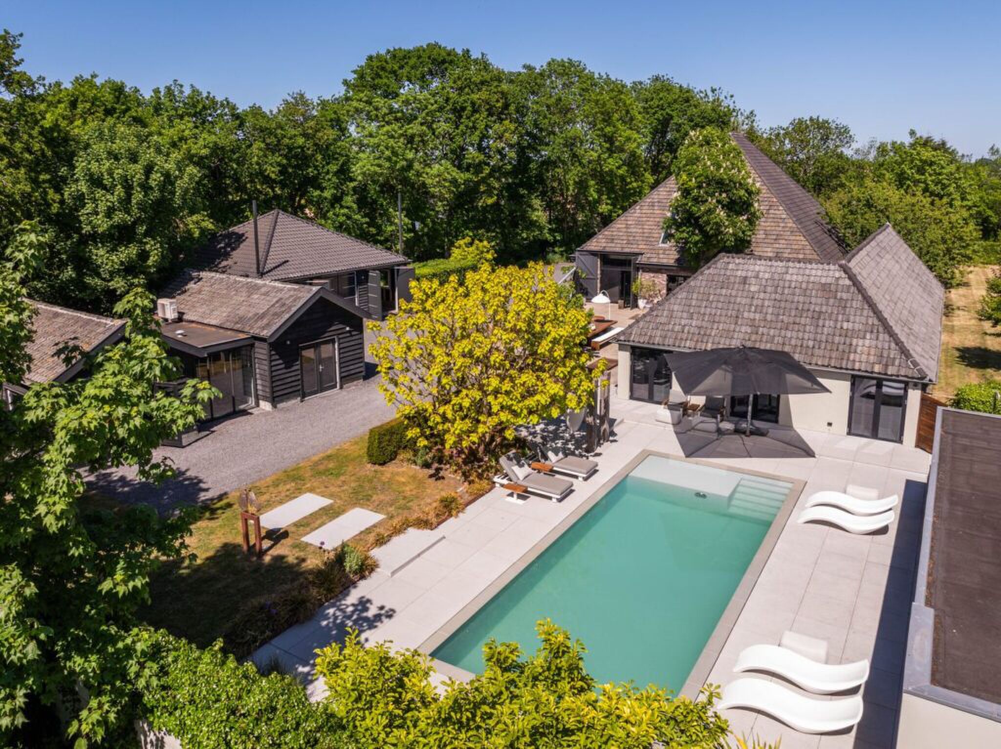 Vertoeven in Bergen is sowieso niet goedkoop, laat staan in deze luxe woonboerderij aldaar. Dit karakteristieke pand bevindt zich in een van de mooiste delen van het chique dorp in Noord-Holland, aan een rustige laan met veel groen en weinig verkeer. Het perceel beslaat ruim 12.000 vierkante meter, waardoor je hier echt de ruimte hebt om te genieten van rijk aangeklede tuinen. Zo is er sprake van een combinatie van gazon, volgroeide bomen en kleurrijke beplanting. Daarnaast is er rekening gehouden met een royaal terras dat perfect is voor lange zomeravonden en een groot zwembad dat uitnodigt tot ontspanning en verkoeling.