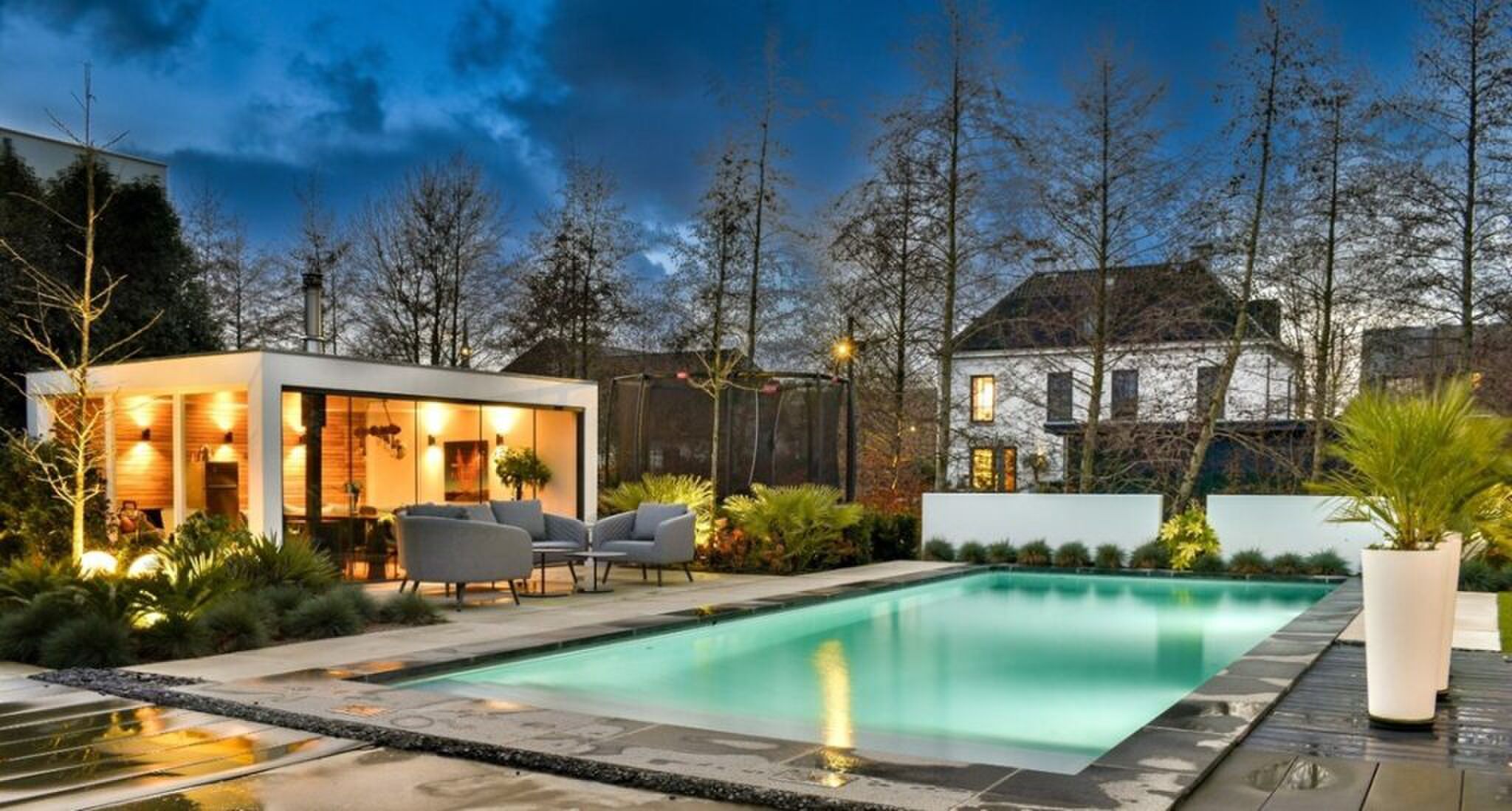 De woning staat namelijk op een stuk grond met een oppervlakte van maar liefst 1.560 vierkante meter. De tuin is echter op een compleet andere wijze ingericht dan de omliggende bosrijke omgeving. Waar we in de Nederlandse bossen louter hoge bomen en struiken aantreffen, staat er in de achtertuin van deze designvilla tal van palmbomen. Deze exotische planten omringen op stijlvolle manier een meterslang buitenzwembad, iets wat aan de vakantie-achtige sfeer van de woning bijdraagt. Als je baantjes trekt in dit royale zwembad heb je daadwerkelijk het idee dat je jezelf op een zonovergoten vakantie-eiland begeeft. Nee hoor, vergis je niet, je bent gewoon aan het zwemmen in het druilerige Noordwijkerhout!