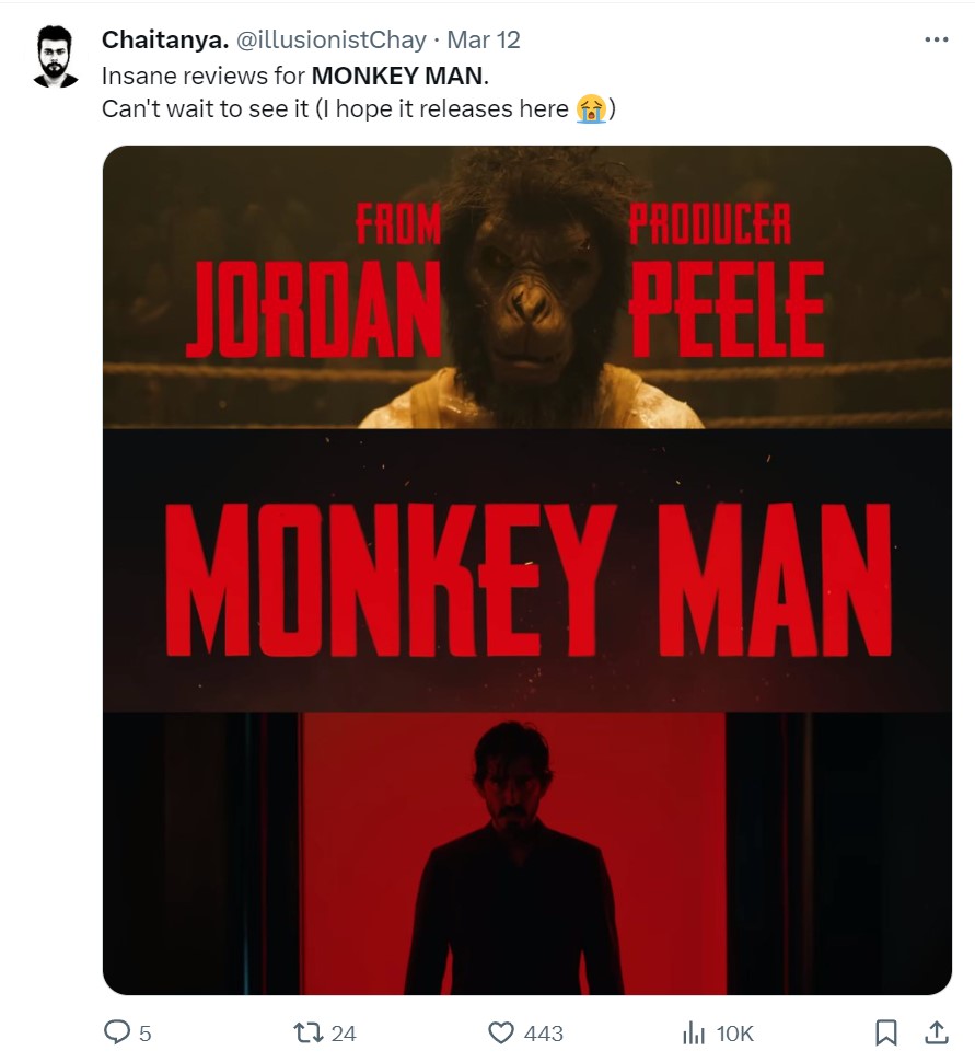 Ook op X (voorheen Twitter) laten mensen zich uit over deze nieuwe film. Zo zijn er reacties te lezen als “Definitely going to see that Monkey Man” en “Insane reviews for MONKEY MAN. Can’t wait to see it”.