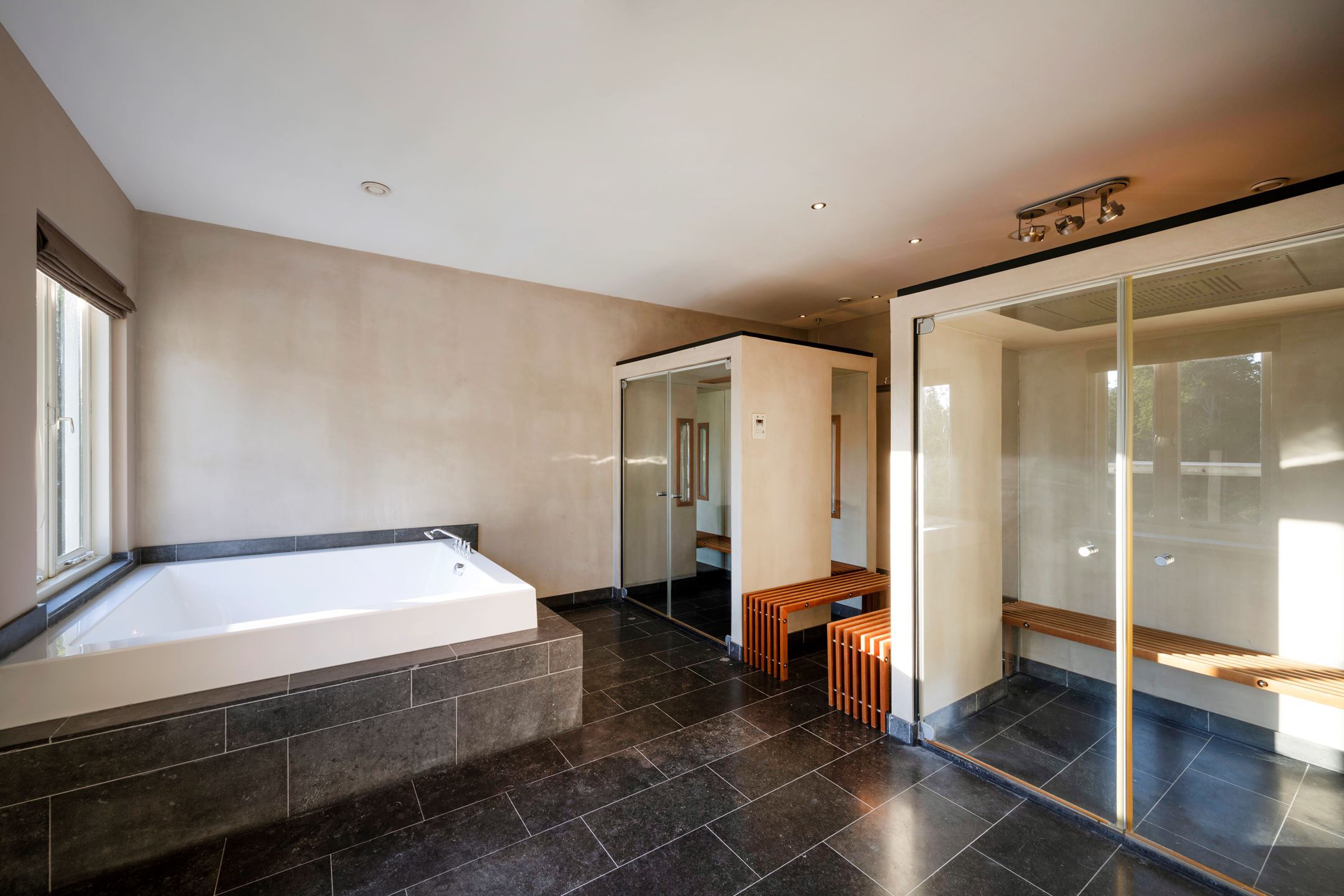 De plek waar je het meeste tijd zal door doorbrengen is ongetwijfeld in het landhuis. Dit is voorzien van allerlei pracht en praal zonder dat het te opzichtig wordt. Gelijk bij binnenkomst word je al welkom geheten met een prachtige glanzende parketvloer en indrukwekkende trap die naar twee kanten wegdraait. De leefruimtes zijn ruim en hebben veel lichtinval waarbij je allerlei openslaande deuren naar de terrassen en tuinen hebt. Verder zal je zeker genieten van de maatwerkkeuken. Tot slot is aan de achterzijde van de woning een wellnessruimte met sauna, douche, stoombad en jacuzzi. Het kan echter nog gekker: op het dak van de kantoorvleugel ligt namelijk een zwembad.
