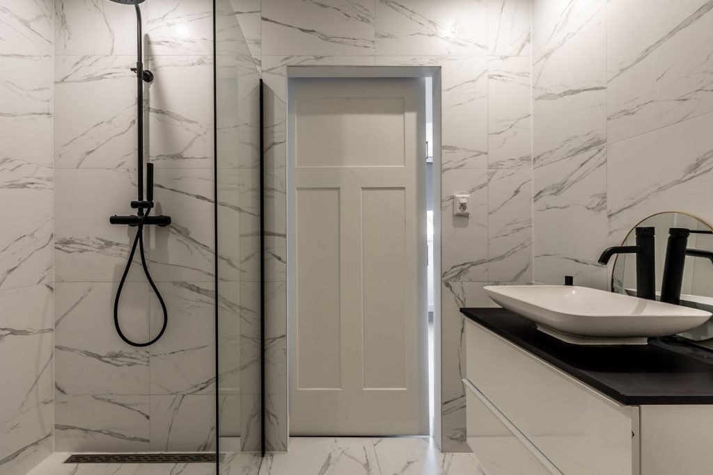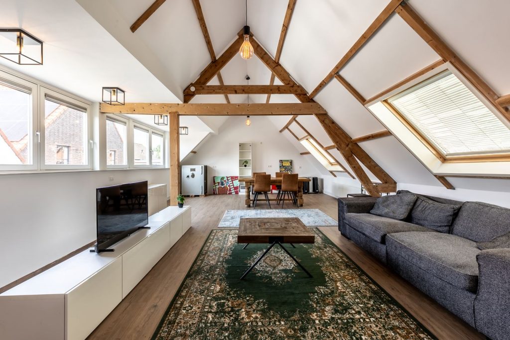 Alle andere kamers op deze verdieping zijn verbonden door middel van een hal met een lengte van 25 meter. Aan de linkerzijde van de keuken is de eerste slaapkamers gelegen waar een moderne badkamer aan verbonden is. Wederom is er aan verfijnde afwerking geen gebrek. Er is gedacht aan een mooie wastafel en een royale inloopdouche. Naast deze badkamer is een spiegelbeeldige badkamer gemaakt die dus nagenoeg identiek is. Het huis is dus perfect voor een groot gezin. Tot slot zijn er een extra slaapkamer en een toilet terug te vinden op deze eerste verdieping. Het hoge plafond en de houten balken geven het geheel een industriële sfeer die wordt afgetopt met een mooi uitzicht op de stadstuin. Hier zijn geen voorbijrijdende auto’s te zien, maar zijn louter hoge bomen en weelderig groen zichtbaar. In deze villa kom je dus helemaal tot rust.