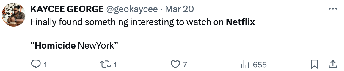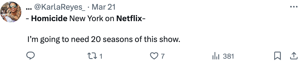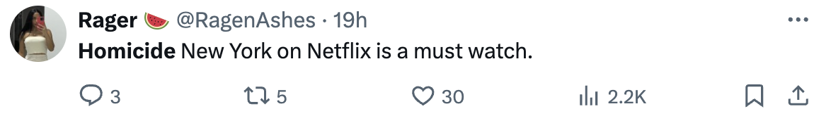 De critici en de gewone kijker spreken positief over de misdaadserie. Zo krijgt de Netflix-serie Homicide: New York op IMDb een 7,3/10 sterren. Ook gaan er tal van positieve woorden van de kijkers over de serie rond op het internet. Zo doen op het platform X (voorheen Twitter) doen een hoop positieve reviews de ronde. Wij hebben een aantal van deze reviews voor jullie geselecteerd.