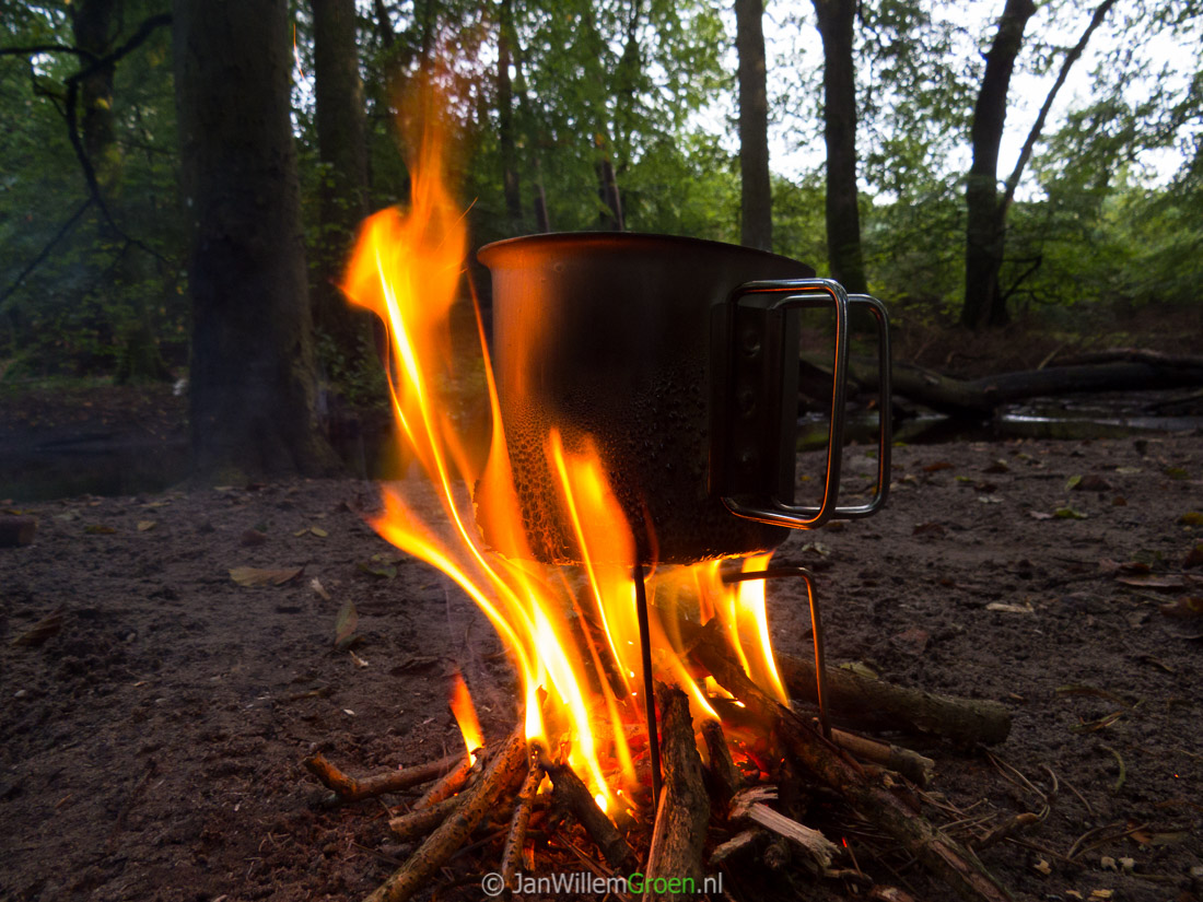 Jan Willem zet koers richting de Leuvenumsche Beek. Hier aangekomen gebruikt hij zijn matig presterende keramische pomp (Chinese makelij) om water te verzamelen. De volgende stap is om het gewonnen water te koken en zo van schadelijke bacteriën te ontdoen.