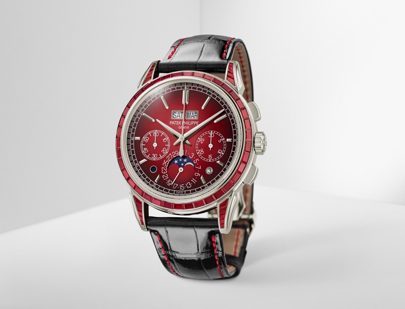 Tijd voor het echte werk! Dit is de Patek Philippe Grand Complications 5271/12P-010 met een marktwaarde van richting de 700.000 euro. Dit horloge heeft alles wat je graag om je pols ziet, van platina horlogekast tot band van krokodillenleer. Dit keer vinden we vuurrode diamanten terug op de bezel en trekt ook de prachtige wijzerplaat onze aandacht. Ook de binnenzijde van het horloge is zeer uniek. Het uurwerk beschikt namelijk over een perpetual calendar, wat betekent dat het horloge een normaal jaar kan onderscheiden van een schrikkeljaar. Dat is natuurlijk wel héél kunstig gemaakt door Patek Philippe!