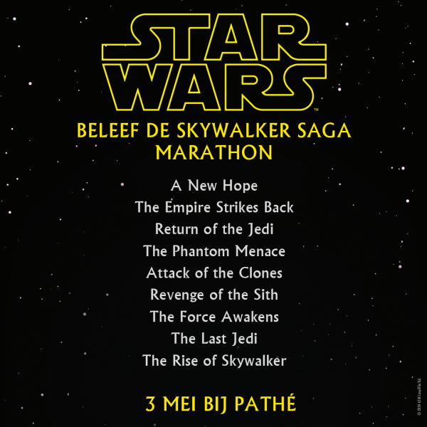 De legendarische sagareeks begint op vrijdag 3 mei om 10:00 en zal ongeveer duren tot zaterdag 4 mei 11:00 uur. De films worden in het Engels gedraaid, zonder Nederlandse ondertiteling. Na een intense dag (en nacht) staat er een smakelijk ontbijt klaar voor alle marathonbezoekers, verzorgd door Pathé zelf.