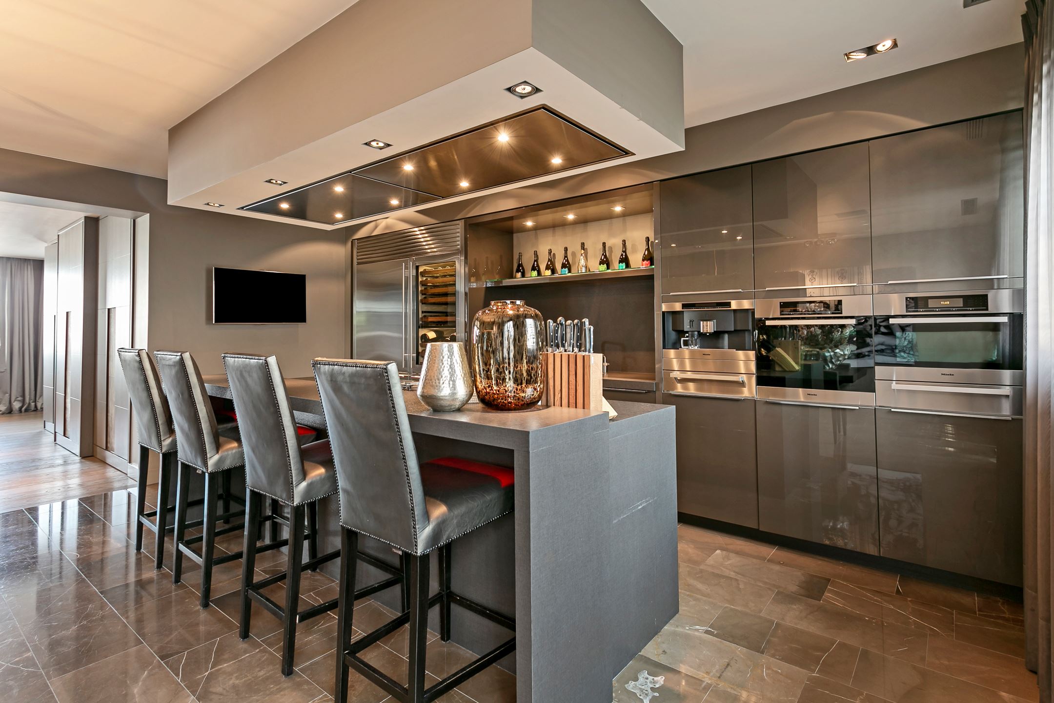 Om maar met de woorden van Eric Kuster te spreken: de indeling van dit penthouse is volledig geïnspireerd op James Bond. Alles is groot en indrukwekkend en heeft een kenmerkend aspect: efficiency. Ondanks de enorme ruimte, is dit penthouse in alle opzichten mega sexy. Je komt via de grote deuren direct in de living. Geen aparte hal om je jas op te hangen, maar gelijk binnen komen. Via de living kom je in de minstens zo indrukwekkende keuken. Een zeer brede keuken welke volledig opgaat in het eetgedeelte. Zo’n grote oppervlakte moet je optimaal benutten. Naast de aanwezige kookapparatuur zien we ook een enorme bar en dito eetgedeelte. Naast de keuken is ook een groot overdekt terras bereikbaar vanuit de living. Doordat Eric Kuster heeft gekozen voor een modulaire indeling is een speels effect ontstaan. De halve wanden zorgen voor de juiste onderverdeling zonder het ruimtelijke effect weg te halen.