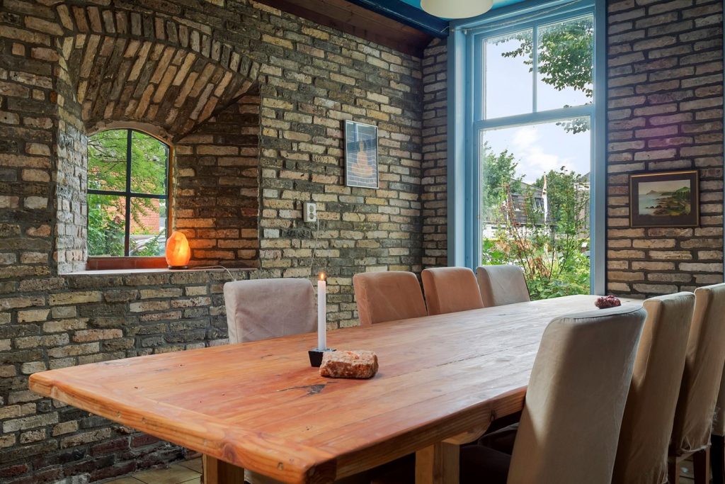 Naast de woonkamer vinden we een grote ruimte dit op dit moment nog vrij kaal is. De vloer en muren kunnen wel wat aandacht gebruiken en ook het eetgedeelte mag opnieuw worden gestyled. Nu heb je tijdens het dineren het idee dat je in een kerk of klooster zit. Wellicht is dat iets wat de toekomstige eigenaar juist graag wil, dan is de juiste sfeer reeds aanwezig, maar het is ook goed voor te stellen dat deze kamer flink op de schop genomen gaat worden. De piano aan de rechterzijde van de kamer kan overigens ook in een nieuwe inrichting voor een fijne opvulling zorgen!