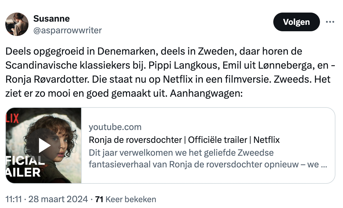 De serie is nog maar net online en bevalt bij critici al erg goed, want op dit moment scoort Ronja the Robber’s Daughter op IMDb een 6.6 van de 10 sterren. Deze komende dagen zullen de beoordelingen en meningen over de serie binnen stromen. Tot nu toe laten mensen op X (Twitter) weten dat ze erg enthousiast zijn om de verfilming van het boek te zien op Netflix: