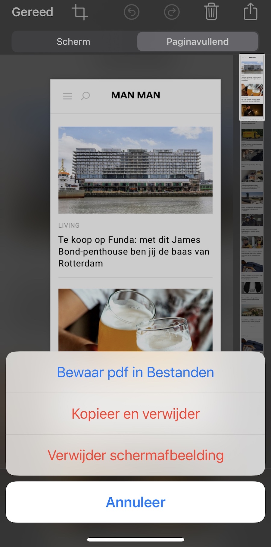 Eigenlijk is het heel eenvoudig. Je gaat met je iPhone via je browser naar de gewenste website. Wanneer de website volledig is geladen maak je een screenshot. Wanneer je deze schermafbeelding hebt gemaakt druk je op de foto ervan die onderin verschijnt. Wanneer je hierop drukt, selecteer je paginavullend.