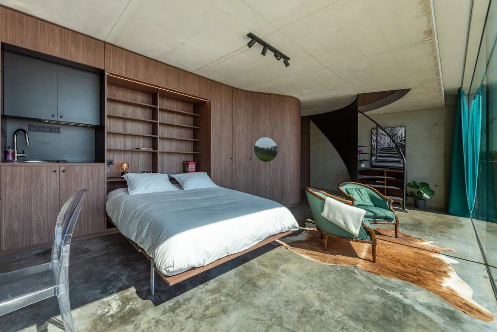 Als je bang bent dat je moeite hebt met ruimte, kan het bed zelfs worden opgevouwen, zodat je meer ruimte hebt. We kunnen ons ook wel voorstellen dat je, eenmaal gesetteld in de Airbnb, jezelf een heus personage uit James Bond waant. Aan jou dan de keuze of je het ziet als de schuilplaats van de nieuwe schurk of dat het juist de nieuwe plek is waar Q als zijn gadgets voor 007 aan het creëren is.