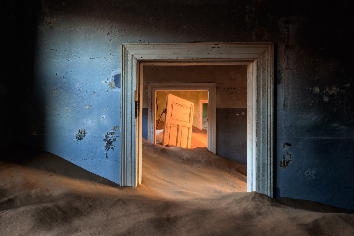 Honderd jaar geleden was Kolmanskop een bruisende stad. Door de ontdekking van diamanten in het omringende gebied kwam er een stroom van mijnwerkers richting het dorpje. Hier bouwden zij een complete nederzetting van ziekenhuizen, scholen, een balzaal, theater en zelfs een casino. Na de eerste wereld oorlog stroomde het dorp langzaam weer leeg. De diamanten raakten op en uiteindelijk werd de stad compleet verlaten. Vandaag de dag heeft de woestijn de stad overgenomen. De gebouwen zijn verbleekt door de zon en overspoeld door zand. Een mysterieuze plaats die je mag bezoeken. Mits je een vergunning krijgt.
