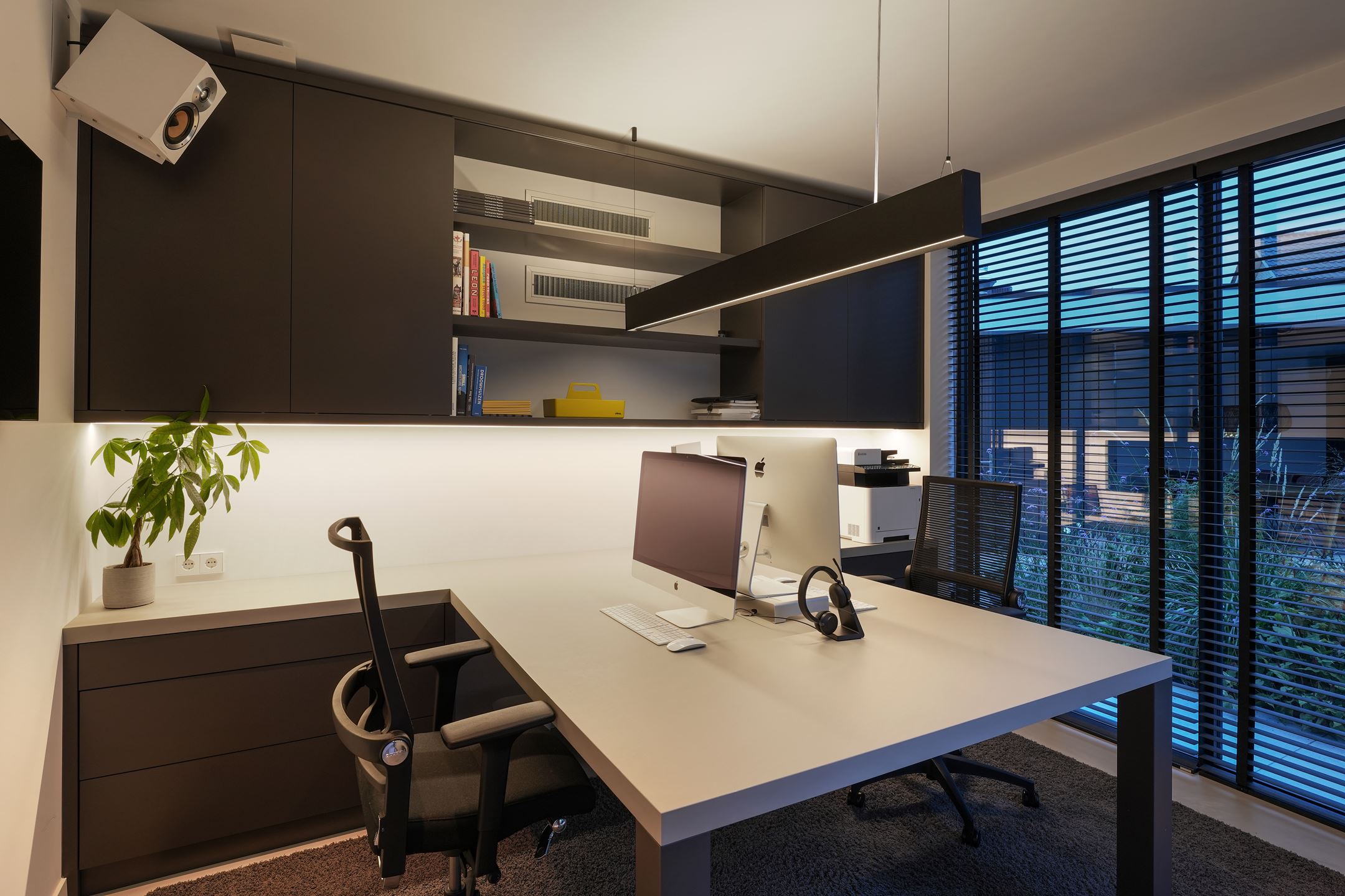 Voor de harde werkers onder ons, is er ook nog de mogelijkheid om lekker thuis te werken vanuit dit chique ogende kantoor. De glazen wanden zorgen ervoor dat je een lekkere bak licht binnenkrijgt, waardoor je energiek aan de slag kan gaan. Bovendien is deze ruimte geluiddicht, heeft hij een airco, en heeft deze een directe aansluiting op de tuin.