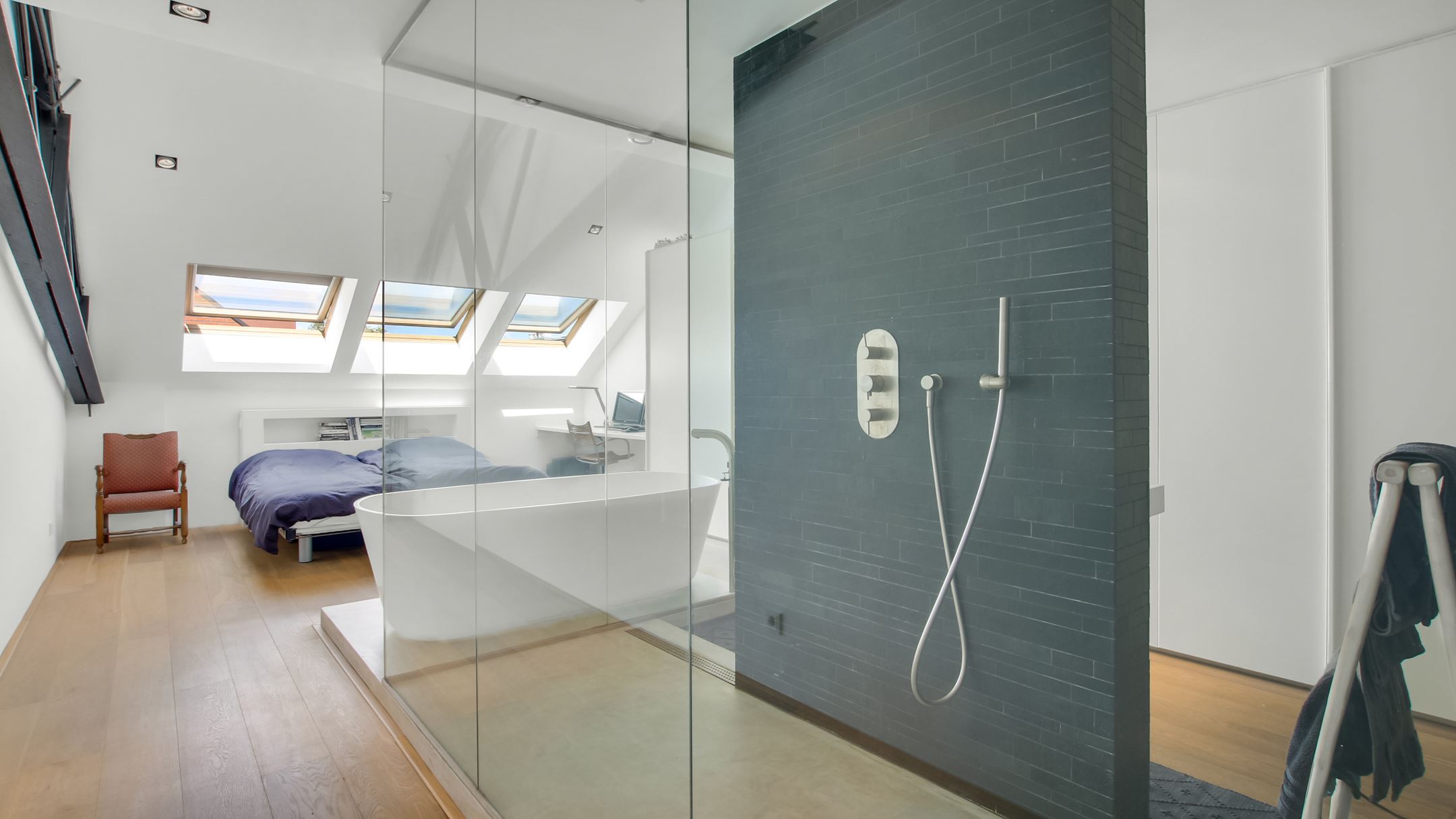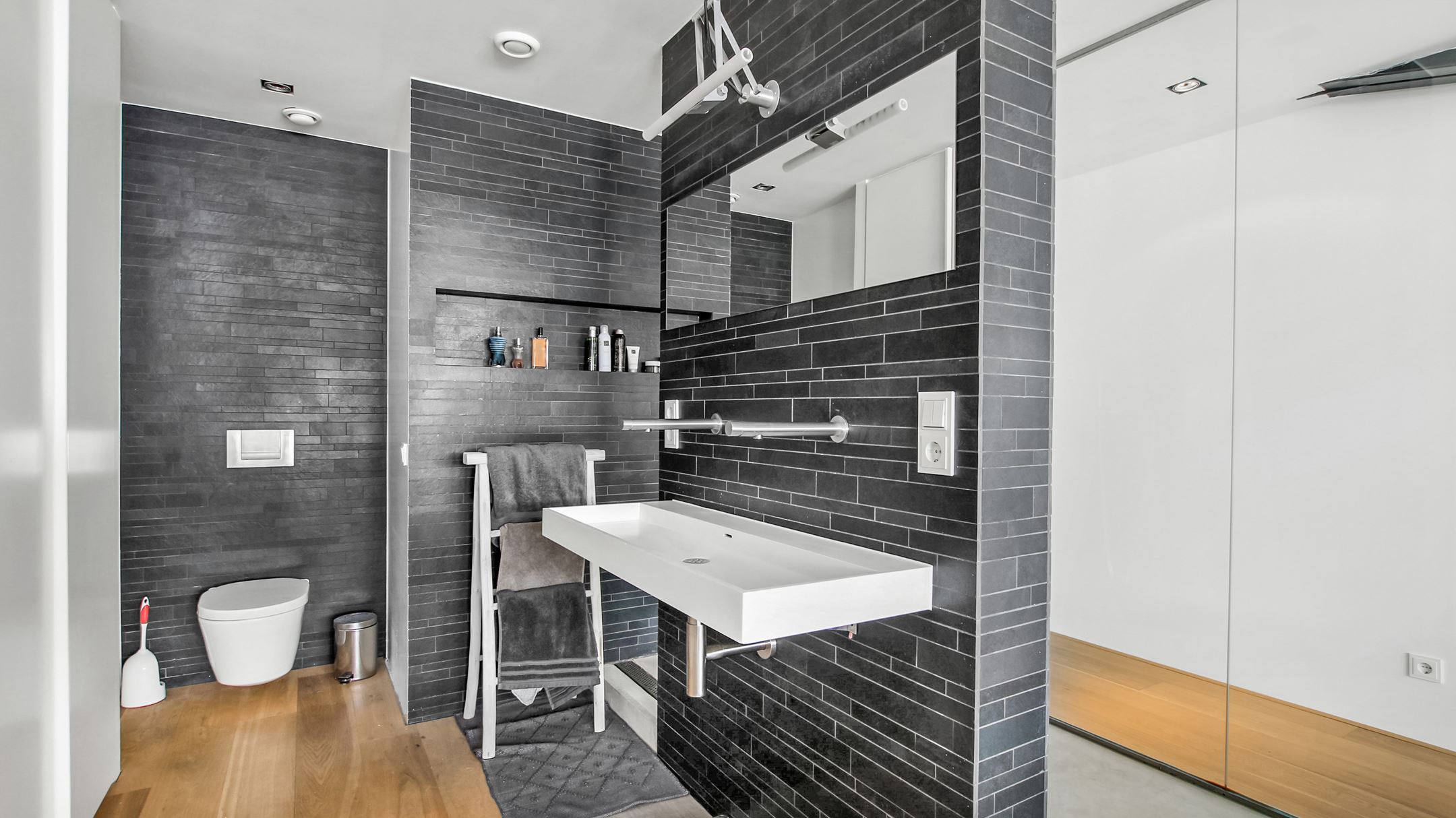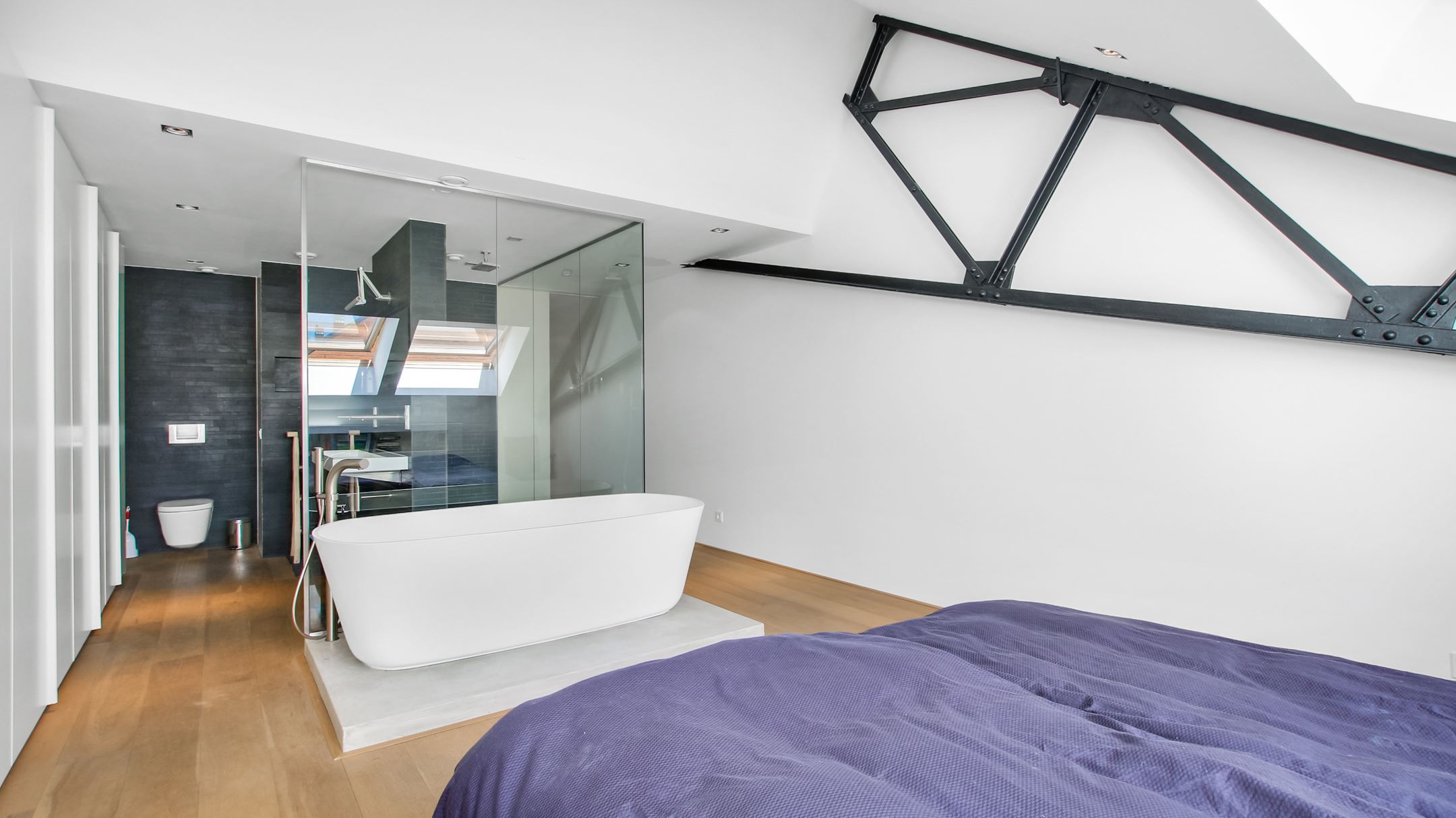 Op de eerste verdieping bevinden zich ook de twee badkamers. Door gebruik te maken van de stoere materialen die we eerder zagen, ontstaat een uniform geheel. Ook hier zien we duidelijk het multifunctionele concept terug. In de eerste badkamer treffen we een inloopdouche aan, net als een toilet en een wastafelmeubel. De tweede badkamer, welke in verbinding staat met de slaapkamer, is voorzien van een Carian vrijstaand bad, een wastafelmeubel en een toilet. Ook hier is een inloopdouche aanwezig.