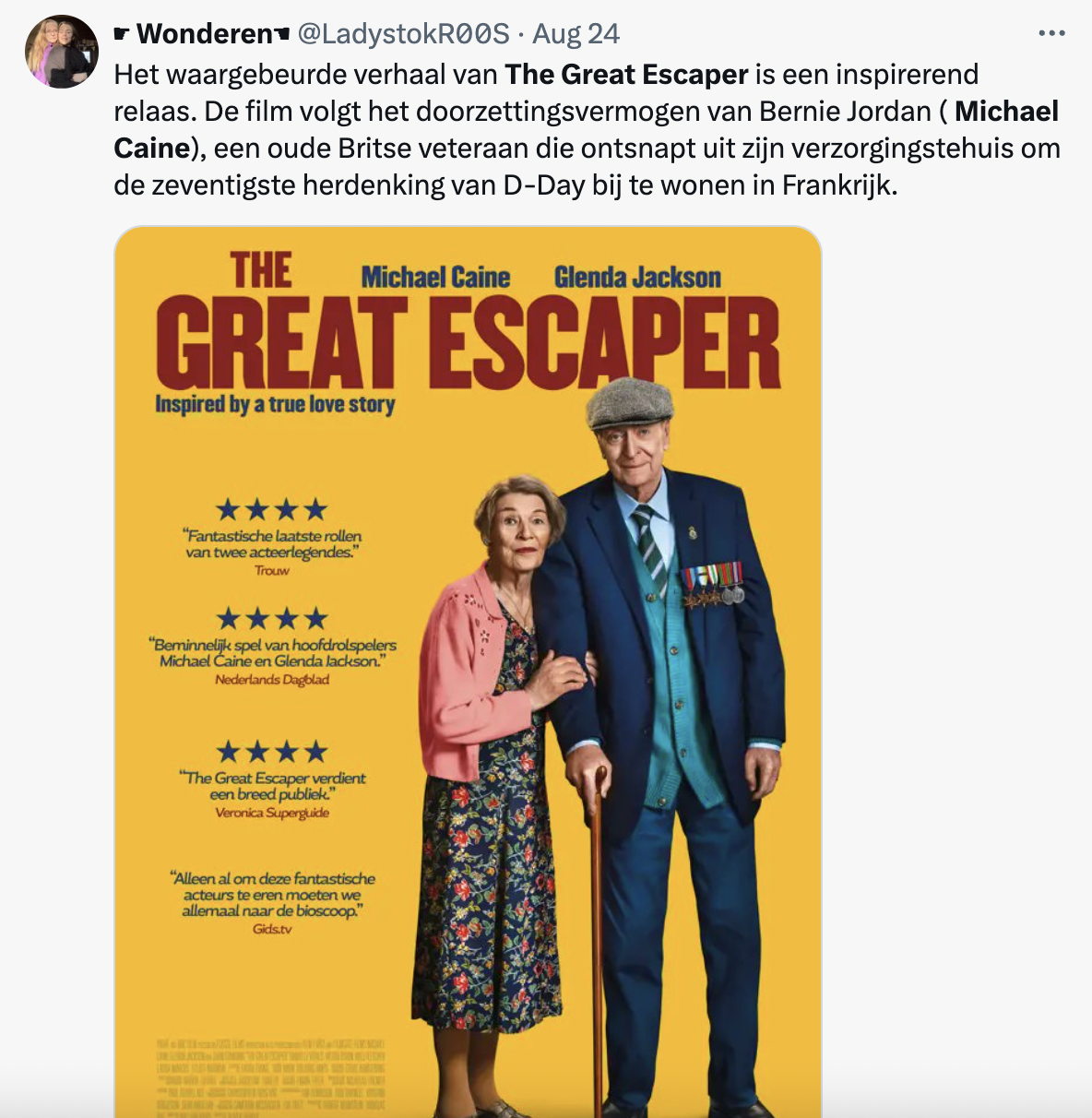The Great Escaper (2023) heeft in korte tijd de harten van Netflix-kijkers veroverd en is snel doorgestegen naar de tweede plek in de Netflix top 10. Deze waargebeurde dramafilm, met in de hoofdrollen de legendarische Michael Caine en de onlangs overleden Glenda Jackson, vertelt het indrukwekkende verhaal van een oudere veteraan die ontsnapt uit zijn bejaardentehuis om een laatste eerbetoon te brengen aan zijn kameraden van D-Day.