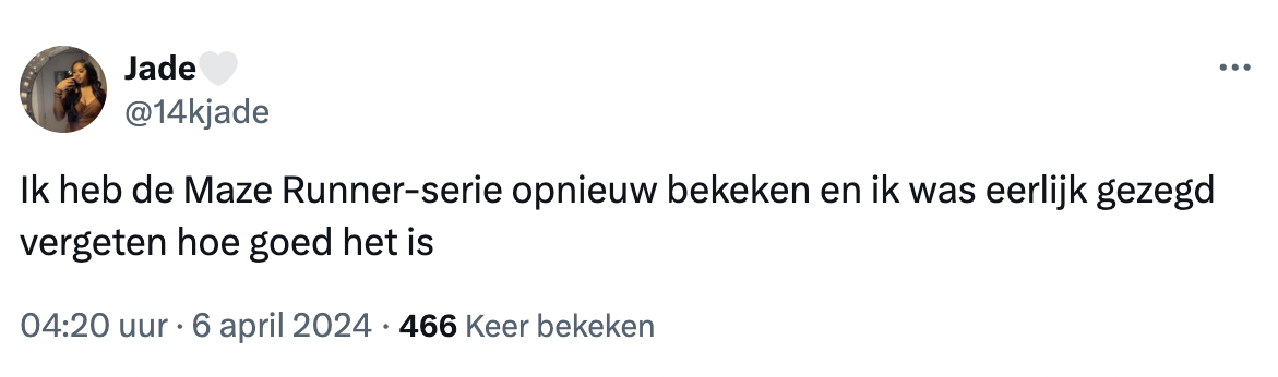 Ondanks dat het eerste deel uit kwam in 2014, zijn veel mensen blij zijn dat de trilogie weer op Netflix staat. De delen zijn immers alle drie binnenkomen in de top 10. Het eerste deel kreeg door critici een nette 6.8 van de 10 sterren op IMDb. De andere twee delen kregen gemiddeld een nette voldoende, namelijk een 6.3/10 sterren. Op RottenTomatoes scoort de film op de Tomatomater (critici) een goede 65% en een Audience Score van 68%. Daarnaast is de ‘normale’ kijker op X (voorheen Twitter) erg enthousiast over de comeback van de trilogie op Netflix. We hebben er een aantal voor je geselecteerd. Check ze hieronder: