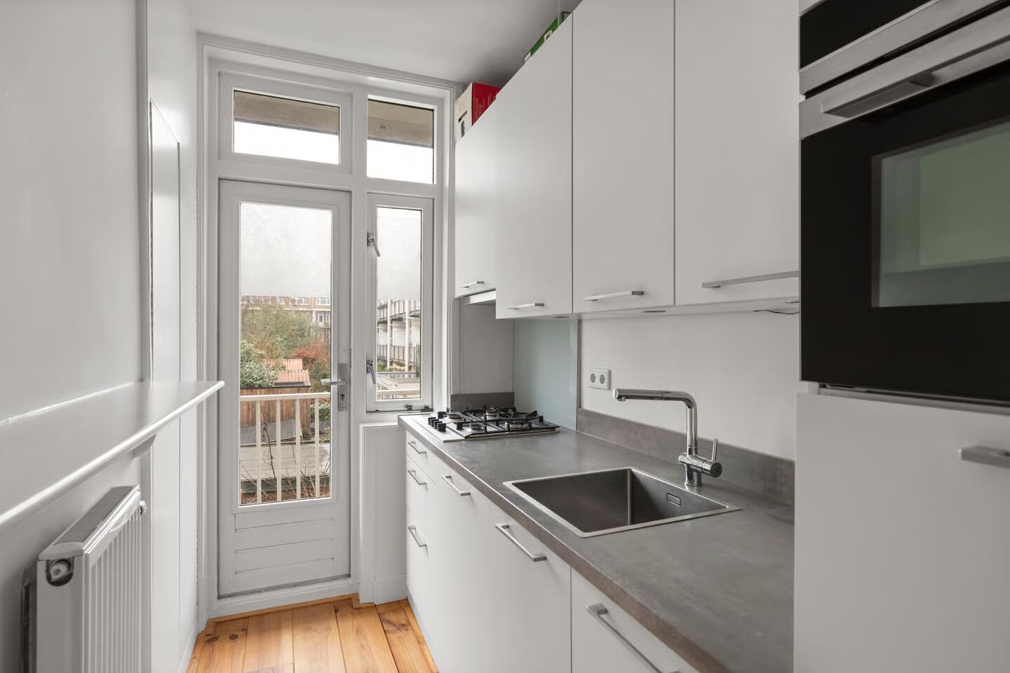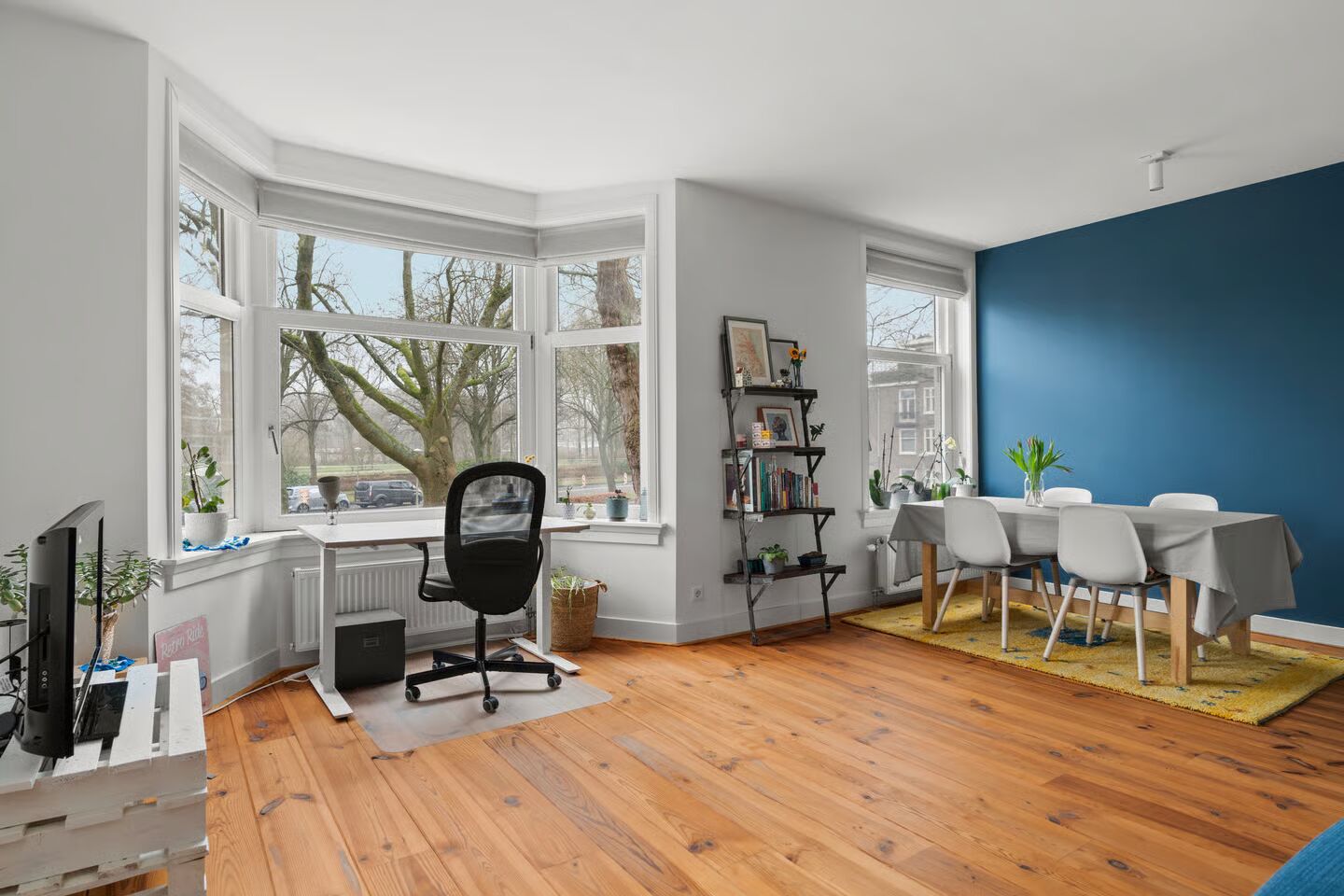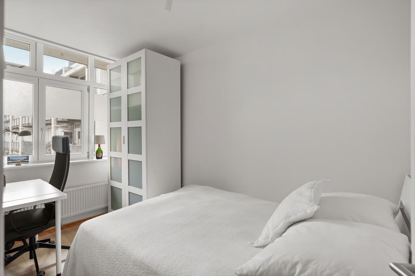 De woning zelf is met 55 vierkante meter geen gigantisch penthouse, maar wél slim ingedeeld. Twee slaapkamers, een lichte woonkamer met grote ramen en een balkon over de hele breedte van het appartement zorgen voor dat typische Amsterdamse comfort met een moderne twist. De Siemens- en Bosch-apparatuur in de keuken doet vermoeden dat Wouter zijn maaltijden nét iets beter warm kan maken dan de gemiddelde student om de hoek.