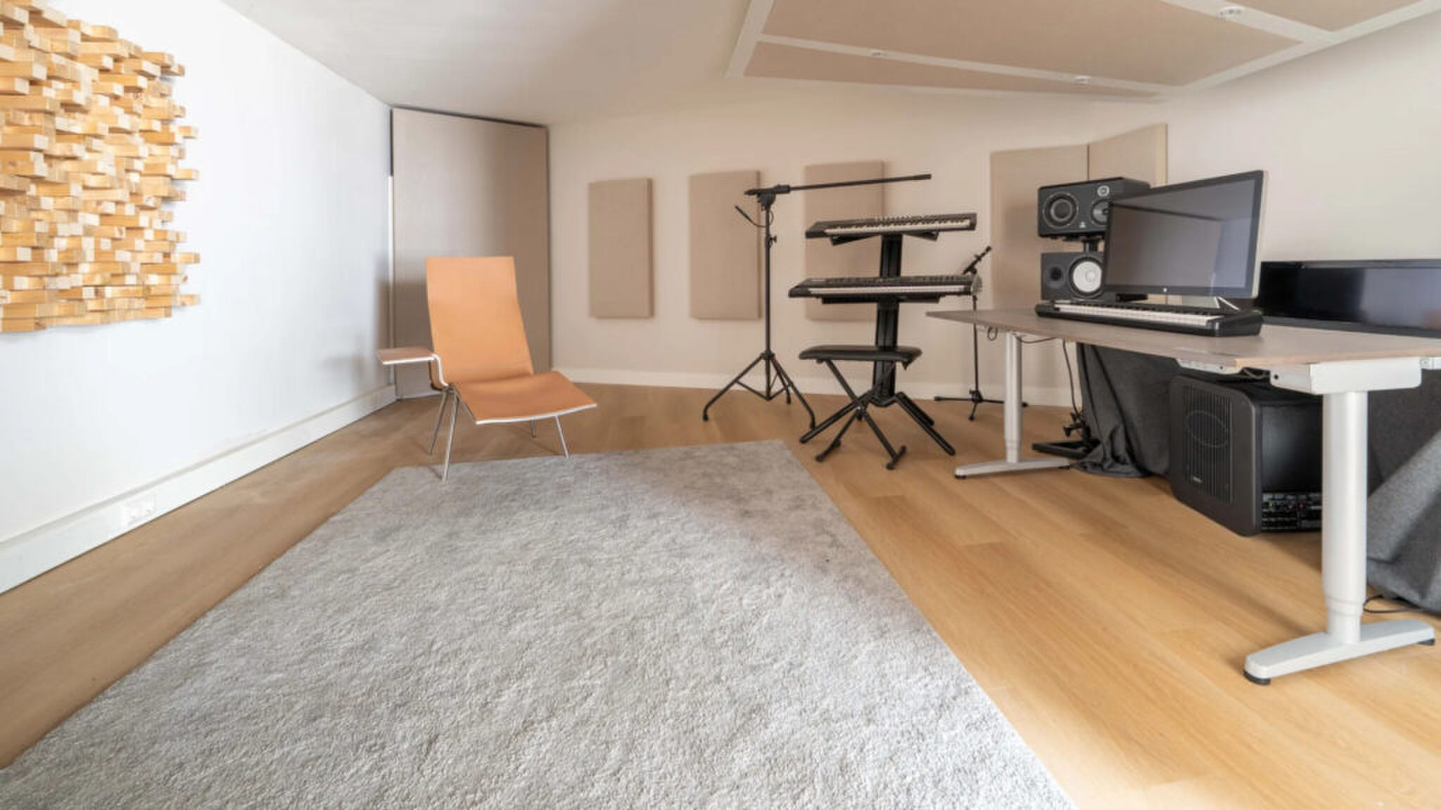 Binnen is er zat ruimte: zo’n 250 m² woonoppervlak. Beneden zijn twee kamers, waarvan er nu één als studio wordt gebruikt. Handig, want je kunt er net zo goed een kantoor, praktijk of aparte woonruimte van maken. Verder zijn er twee grote woonkamers: eentje aan de voorkant en een centrale ruimte die perfect werkt als speelkamer of tweede living.