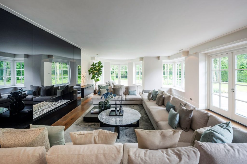 Oké, de tuin is goedgekeurd, maar wat vinden we terug aan de binnenzijde van dit miljoenenhuis? De ontvangsthal zet ons al direct voor een lastige keuze. Het ingenieuze trappenhuis biedt meteen bij binnenkomst toegang tot de eerste verdieping, de begane grond en de benedenliggende verdieping. Laten we beginnen bij de woonkamer op de begane grond die door middel van de hoge deuren aan de linkerzijde te betreden is. Hier zien we direct hoe het huis aan het enorme woonoppervlakte van ruim 1.000 vierkante meter is gekomen, want aan ruimte komt deze woonkamer niks te kort. We treffen een modern eetgedeelte met een subtiel doorkijkje naar de comfortabele living. Minstens twaalf personen kunnen plaatsnemen op de enorme bank die uitzicht biedt op het ingebouwde flatscreen aan de muur en de omliggende tuin aan de achterzijde van de woning. Via diverse extra zitruimtes is de aangrenzende keuken te betreden. Het moderne kookeiland dat hier is geplaatst moet helpen bij het bereiden van chique diners. Er is uiteraard enkel gebruik gemaakt van hoogwaardige materialen die qua kleur tot in perfectie op elkaar afgestemd zijn. Verschillende grote deuren bieden vanuit de begane grond meerdere opties om de achtertuin op te zoeken.